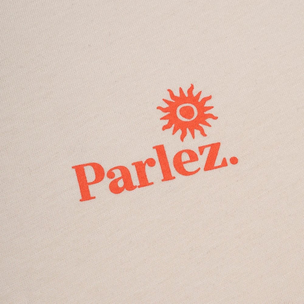 The Parlez Ador T-Shirt in Shell. A short sleeve tee made from premium GOTS Certified, 100% organic cotton with a classic ribbed crewneck. Detailed with a small, printed logo on the chest and a large seasonal print on the back.