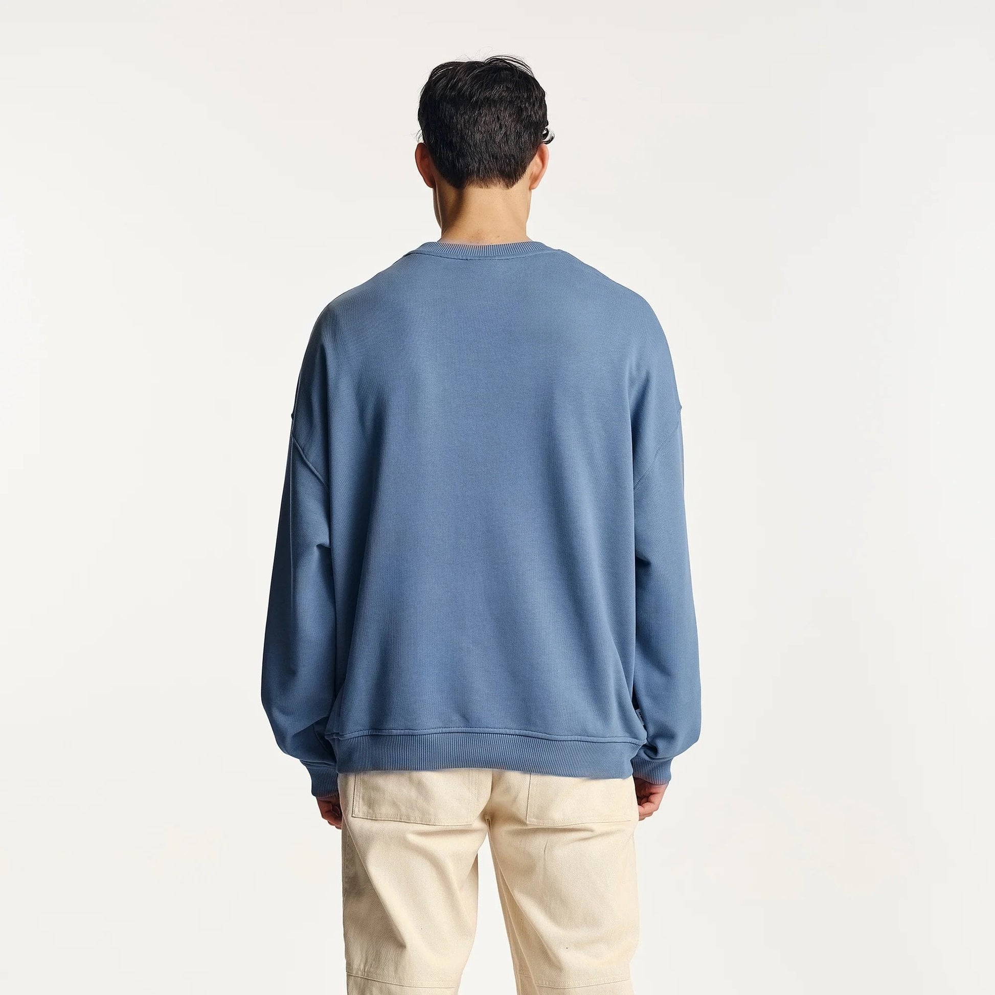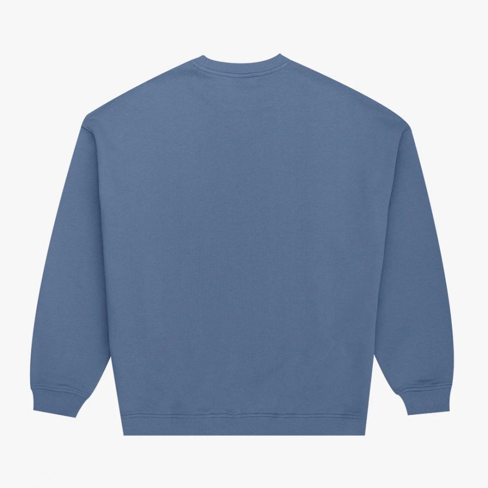 The Vernon Crew in China Blue. An oversized sweatshirt, made from 80% Organic Cotton / 20% Recycled Polyester 350gsm loopback material. Featuring a classic crew neck, drop shoulders and two side seam pockets. Finished with a simple embroidered logo on the chest.