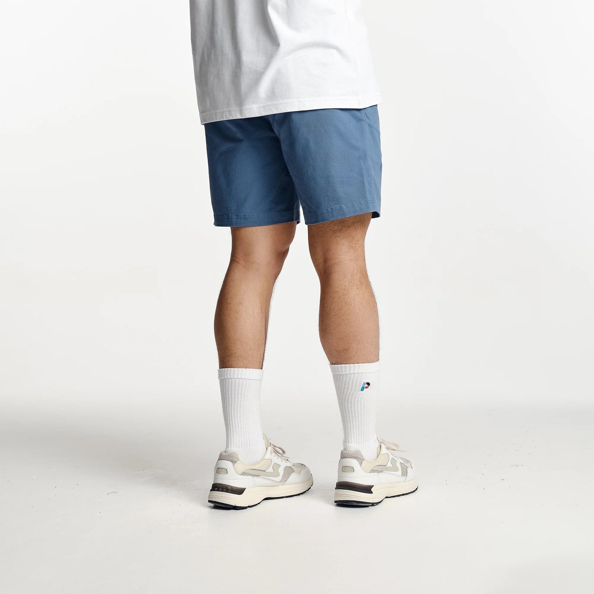 The Wilmot Shorts in China Blue. Relaxed fit, mid-length shorts cut from a durable, organic cotton blend. Featuring an elasticated drawstring waist for an adjustable fit, twin side seam pockets and one back pocket. Finished with a simple, embroidered logo on the hem.