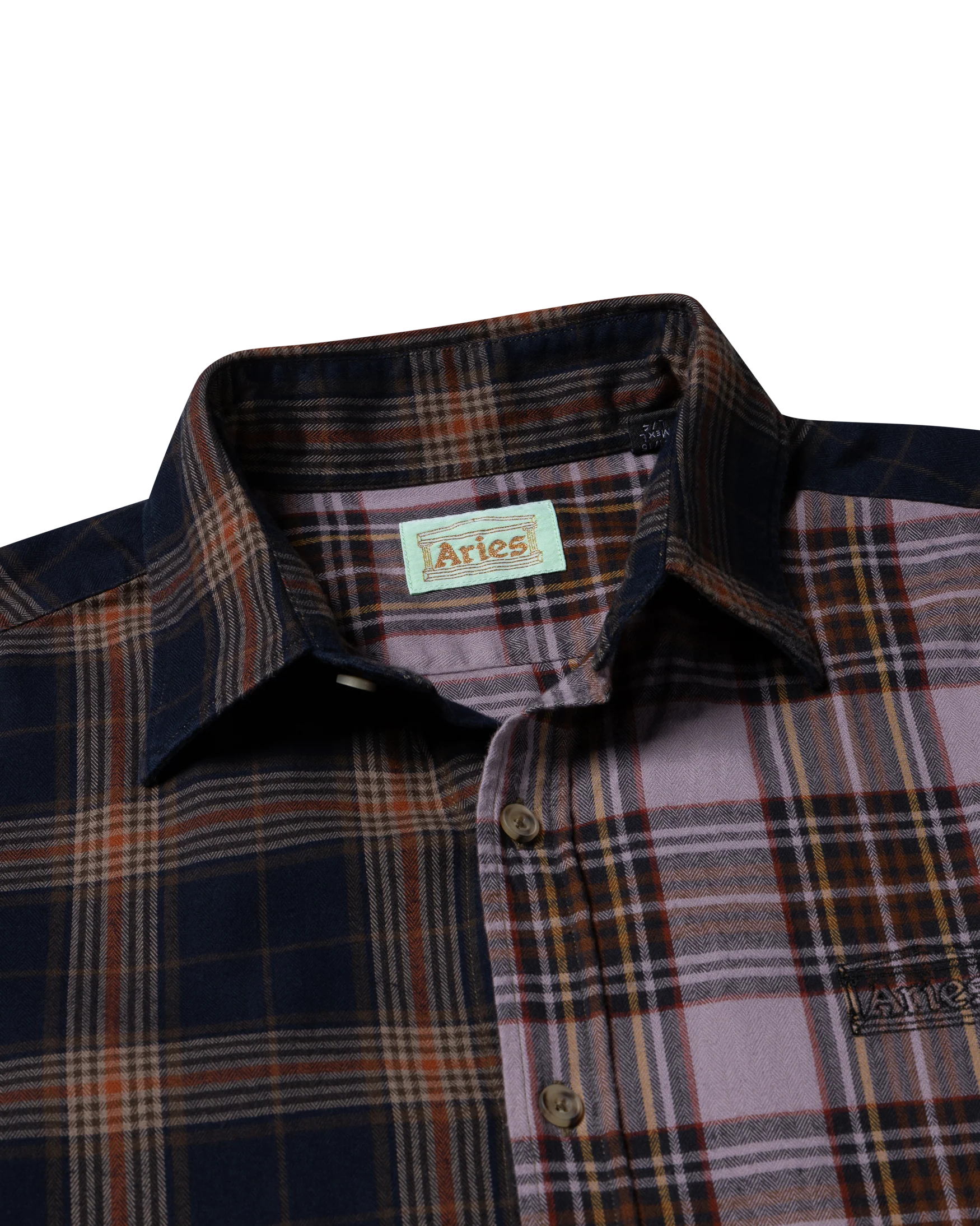 This Areis Overdyed Patchwork long-sleeved shirt features a unique patchwork design crafted from various cotton checks, over-dyed in a rich purple hue for depth and character. The embroidered Aries temple logo on the chest adds a distinctive detail, blending traditional craftsmanship with contemporary style. Ideal for those seeking a statement piece with expert attention to fabric and finish.