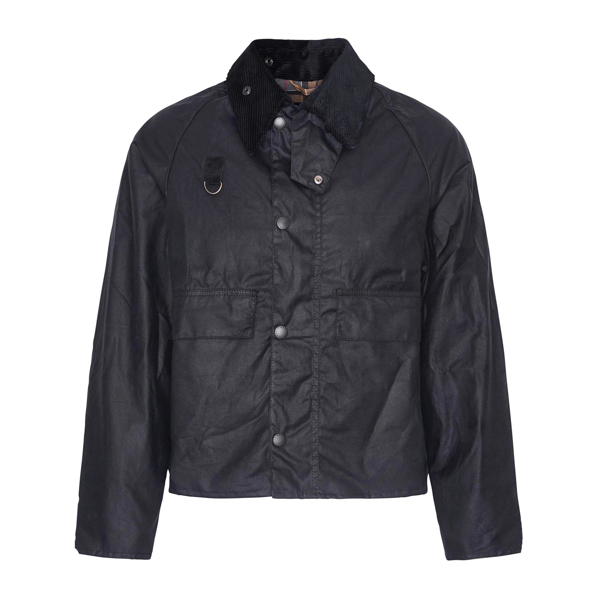 The Barbour Spey Slim Waxed Jacket in black is a revival of an archival piece. Made from waxed cotton, it has a shorter length & is a great choice for country walks & city adventure. It features a classic cord collar, throat flap, two pockets at the front, and a handy chest D-ring. This jacket offers a timeless look with practical details.