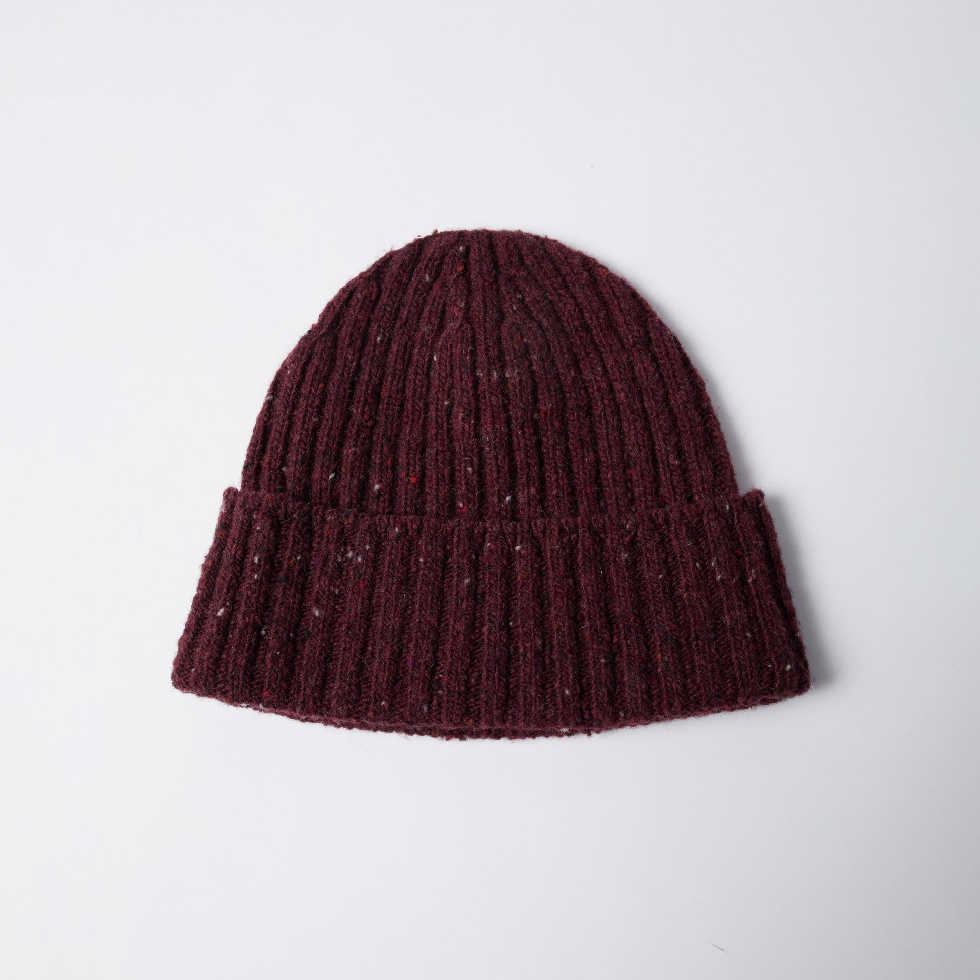 Circular-knitted beanie with the Reversed flag embroidery on it.