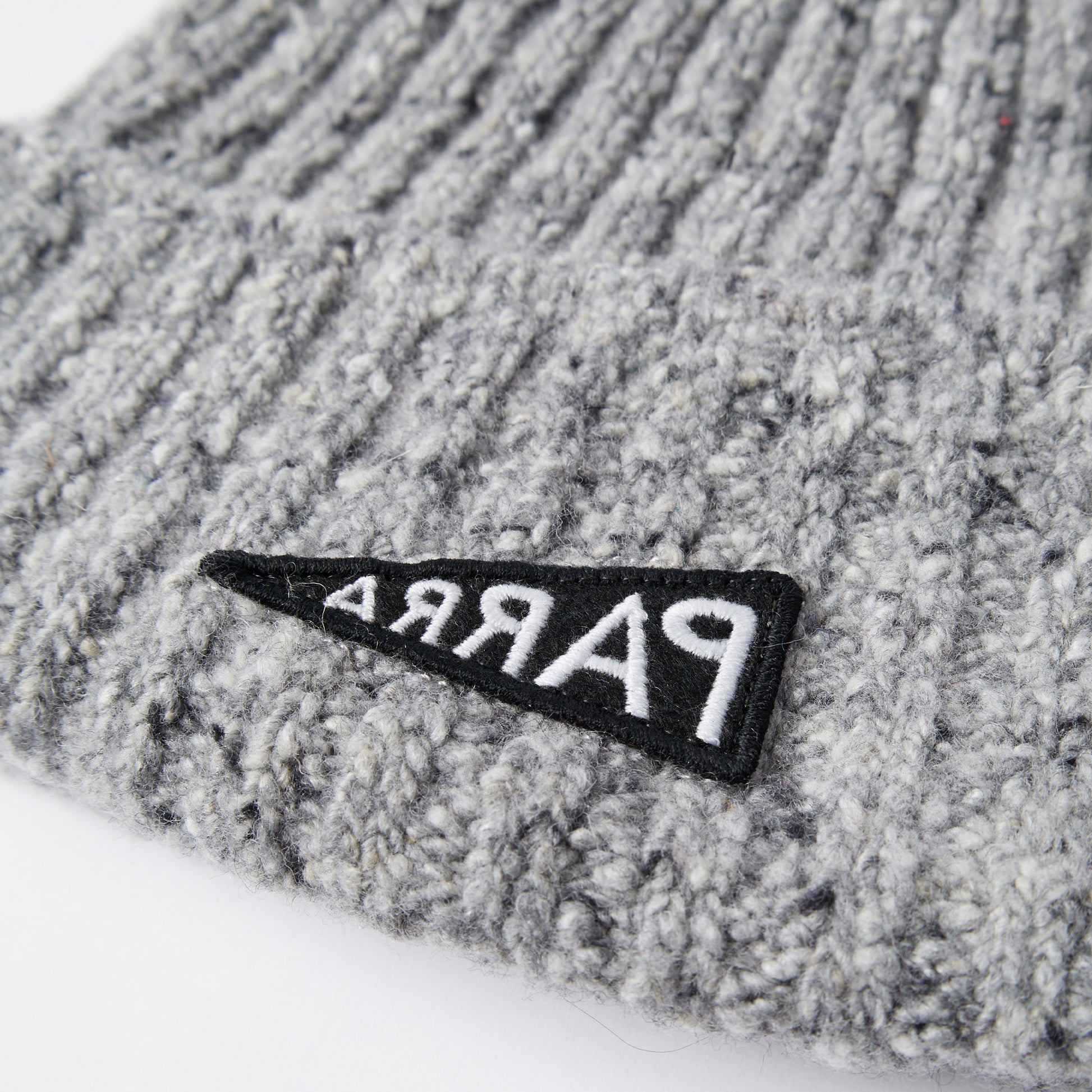 Circular-knitted beanie with the Reversed flag embroidery on it.