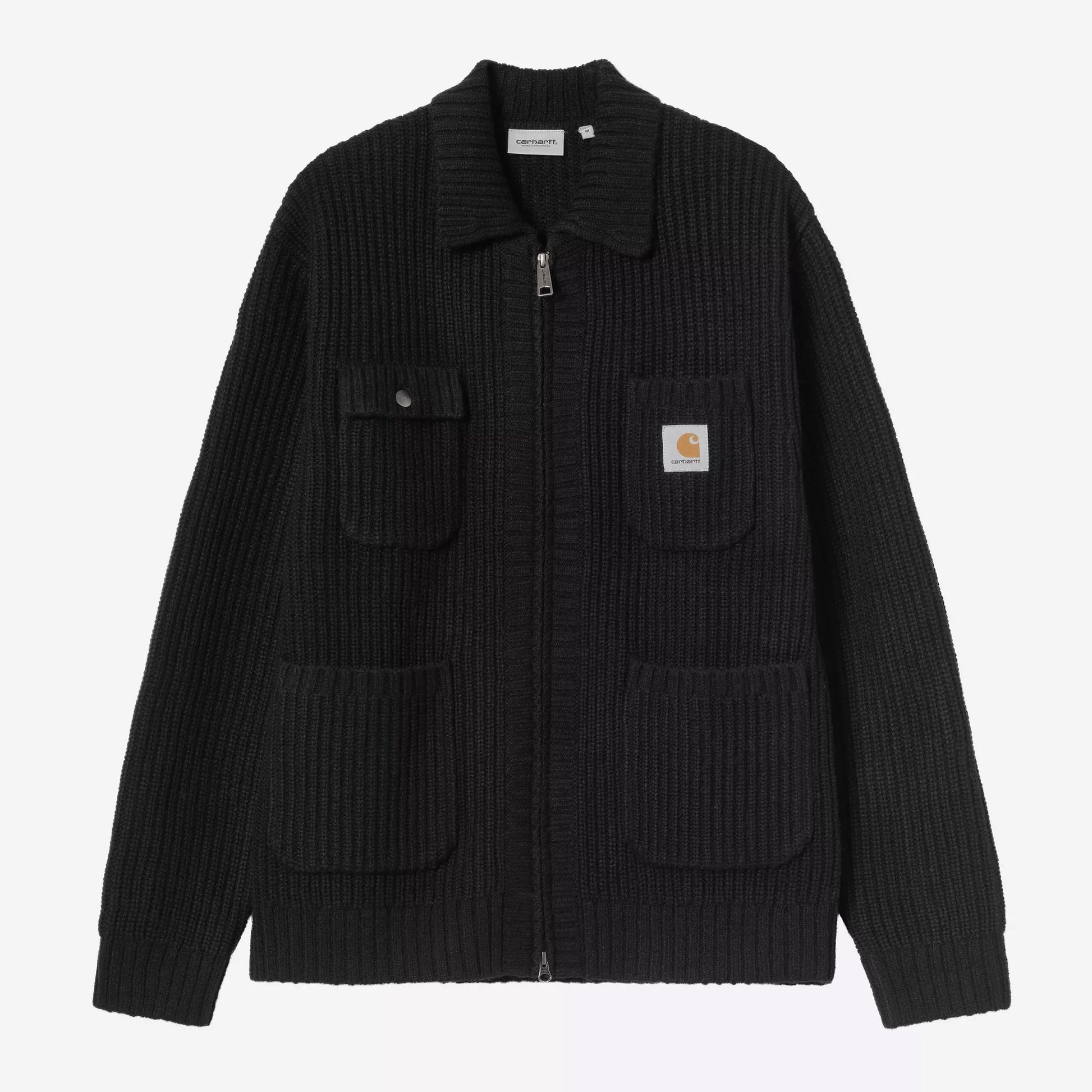 The Chore Knit Jacket Black combines durability and refined design crafted with fully-fashioned knitting at the armholes for enhanced fit and comfort. Its silhouette reflects the classic chore coat, featuring four practical patch pockets—one secured with a buttoned flap—for versatile storage. A branded two-way zip adds functionality, while the woven Square Label offers a subtle signature detail that completes this expertly tailored piece.