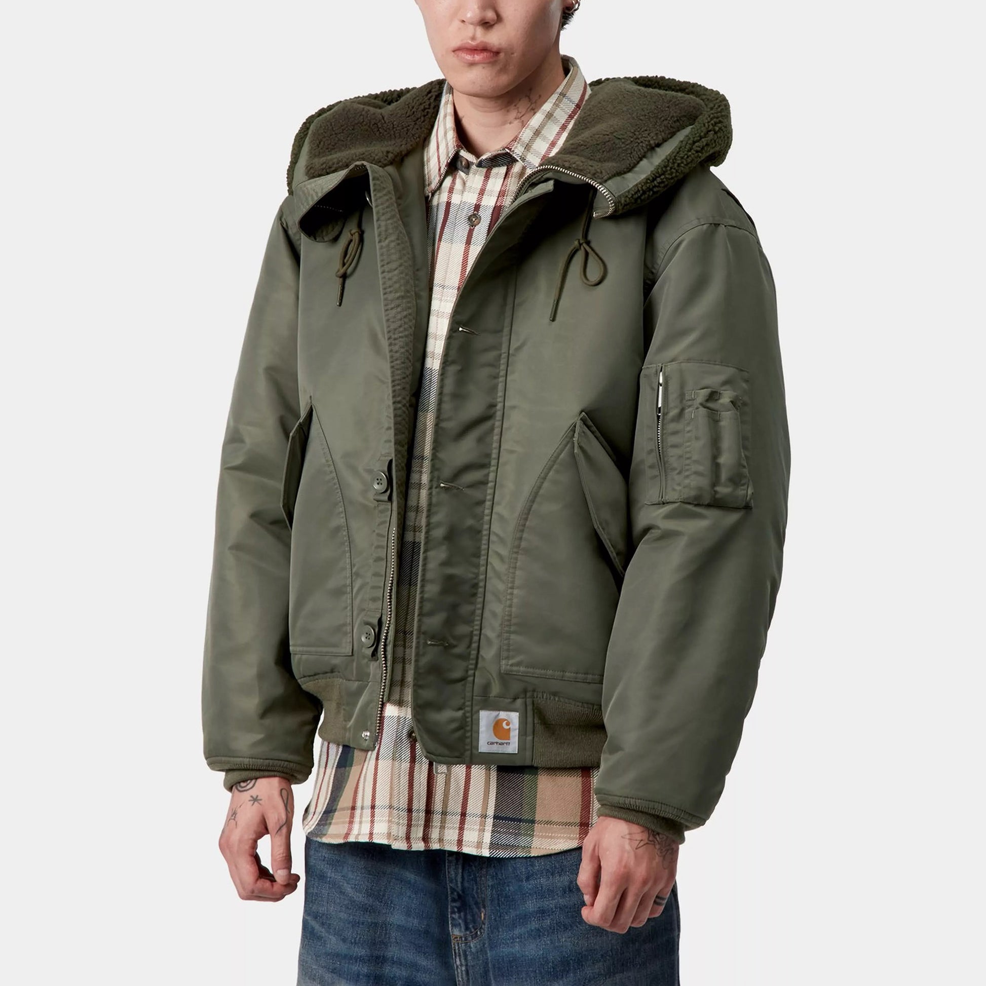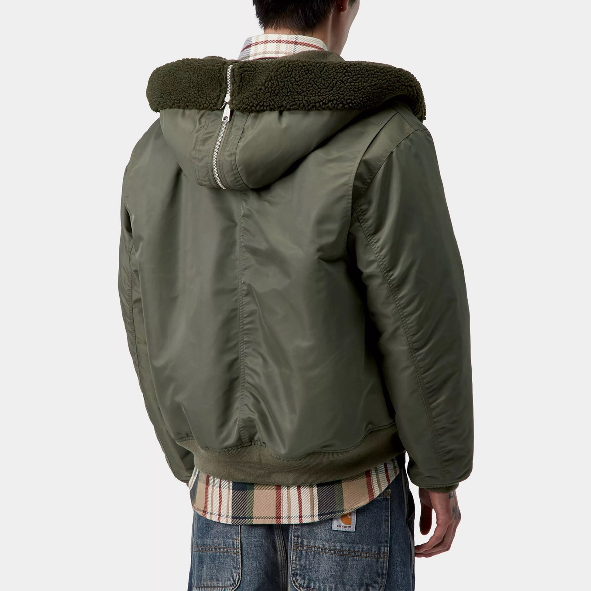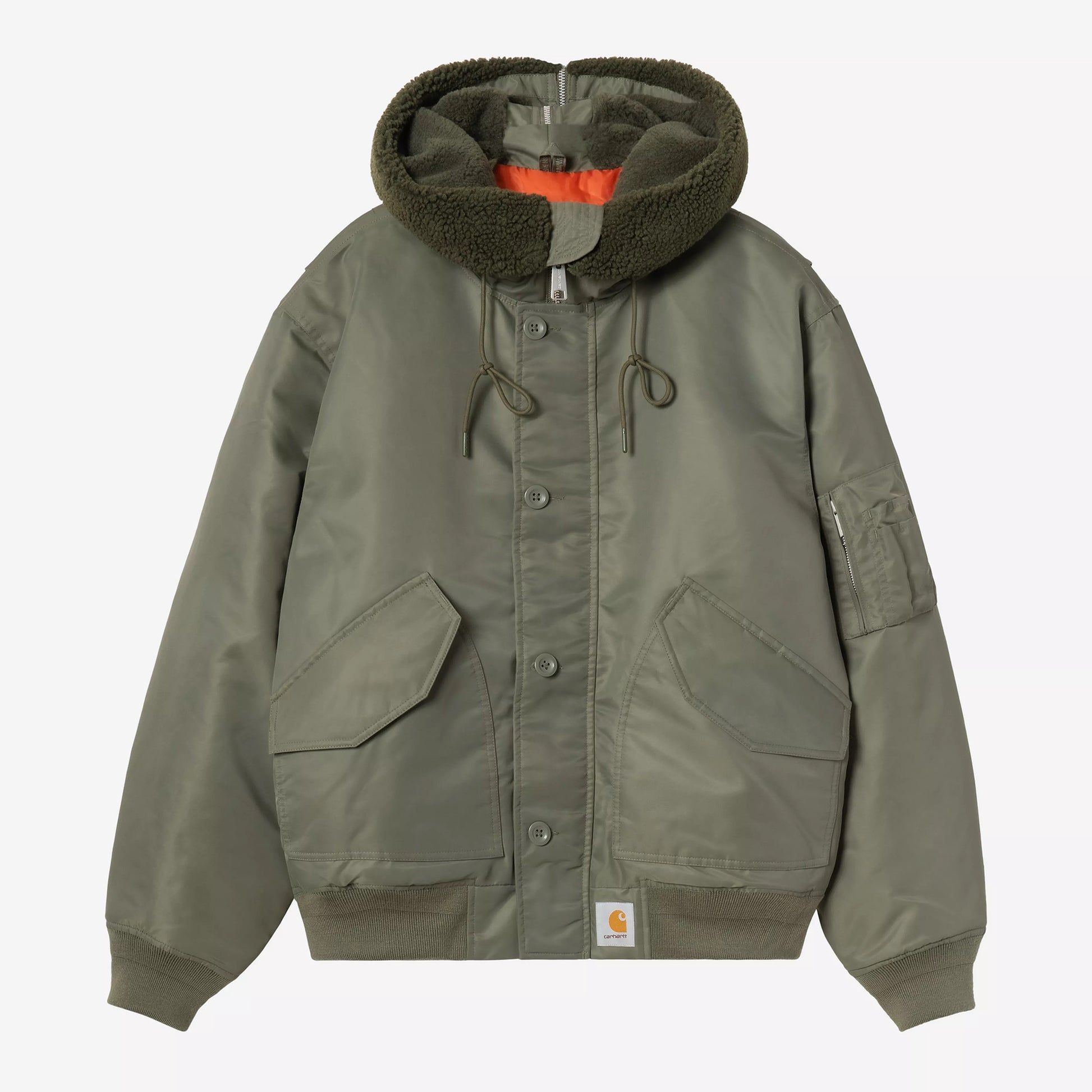The Hooded Oltera Bomber in Cypress / Persimmon is crafted from lined, midweight nylon with water-repellent properties to keep you dry. It features a large adjustable funnel hood with a zip at the back and a detachable pile brim. The jacket includes two front flap pockets and a zipped sleeve pocket for convenient storage. Triple-stitched details add durability to key areas, while a woven Square Label finishes the look.