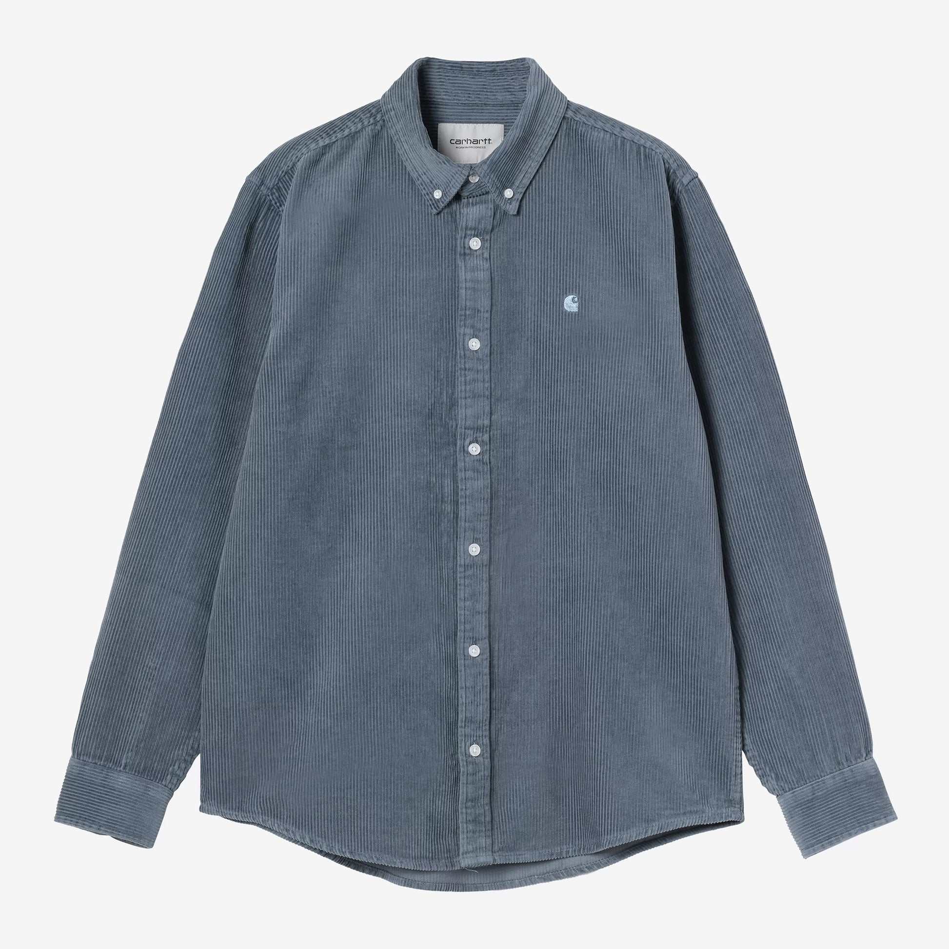 The L/S Madison Cord Shirt in Angelite is made from soft 8 wale cotton corduroy, giving it a comfortable, textured feel. It has a regular fit with a curved hem and a classic button-down collar for everyday wear. The shirt also features a small embroidered 'C' logo on the chest.