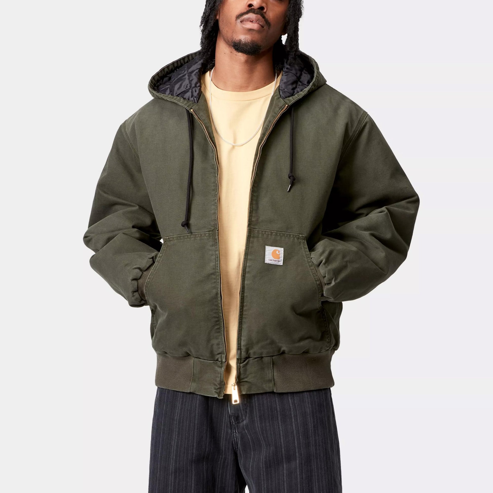 The OG Active Jacket Olive (stone canvas) combines heavyweight 12 oz organic cotton Dearborn Canvas with expert craftsmanship for superior durability. Designed in a roomy original loose fit, it features a diamond-quilted lining that enhances insulation. Functional details include a kangaroo pocket, adjustable hood, and zipped front fastening, while ribbed hem and cuffs ensure a secure fit. Triple-stitch construction adds resilience, making this jacket a reliable choice for both comfort and lasting performance.