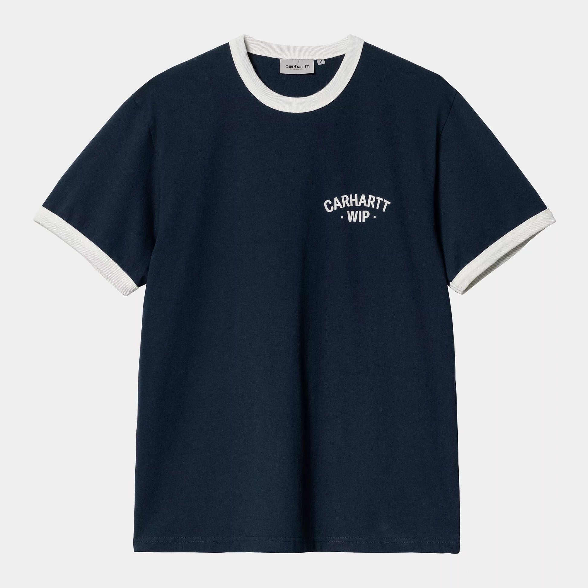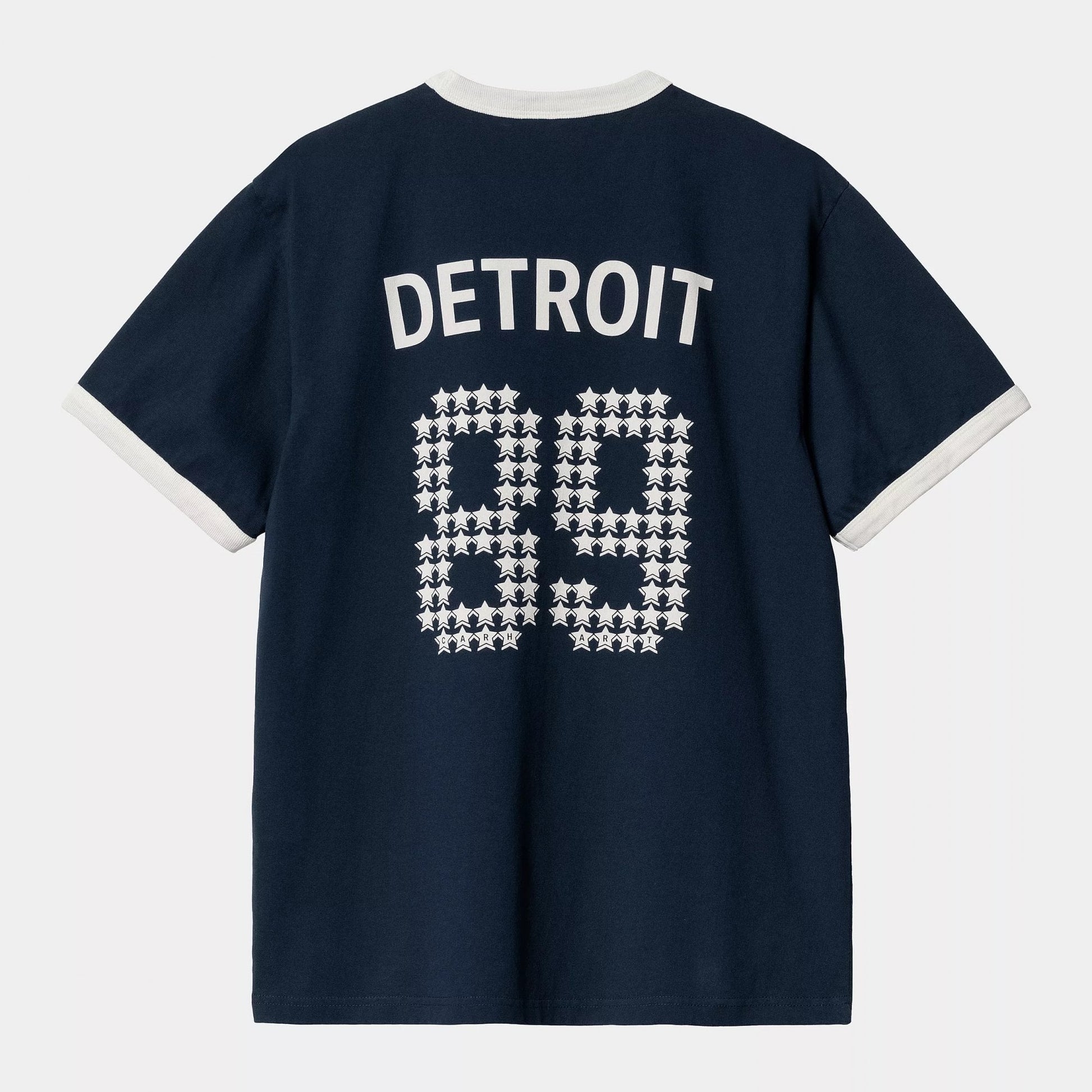 The S/S 89 Ringer T-Shirt is made from midweight cotton jersey in a regular fit, featuring contrasting ribbed trims. Graphic prints appear on the front and back.