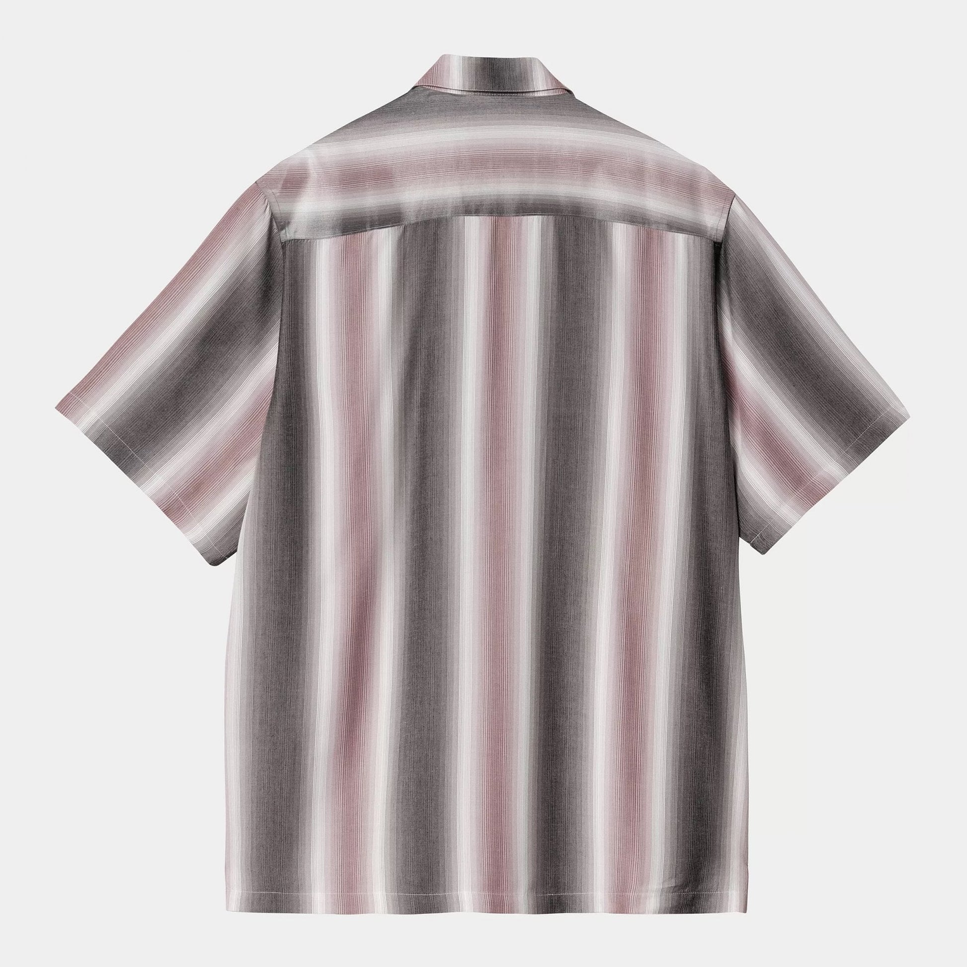 The S/S Dashner Shirt is made from lightweight viscose poplin featuring allover stripes. It also has a camp collar and buttoned front. Logo embroidery appears on the left chest.