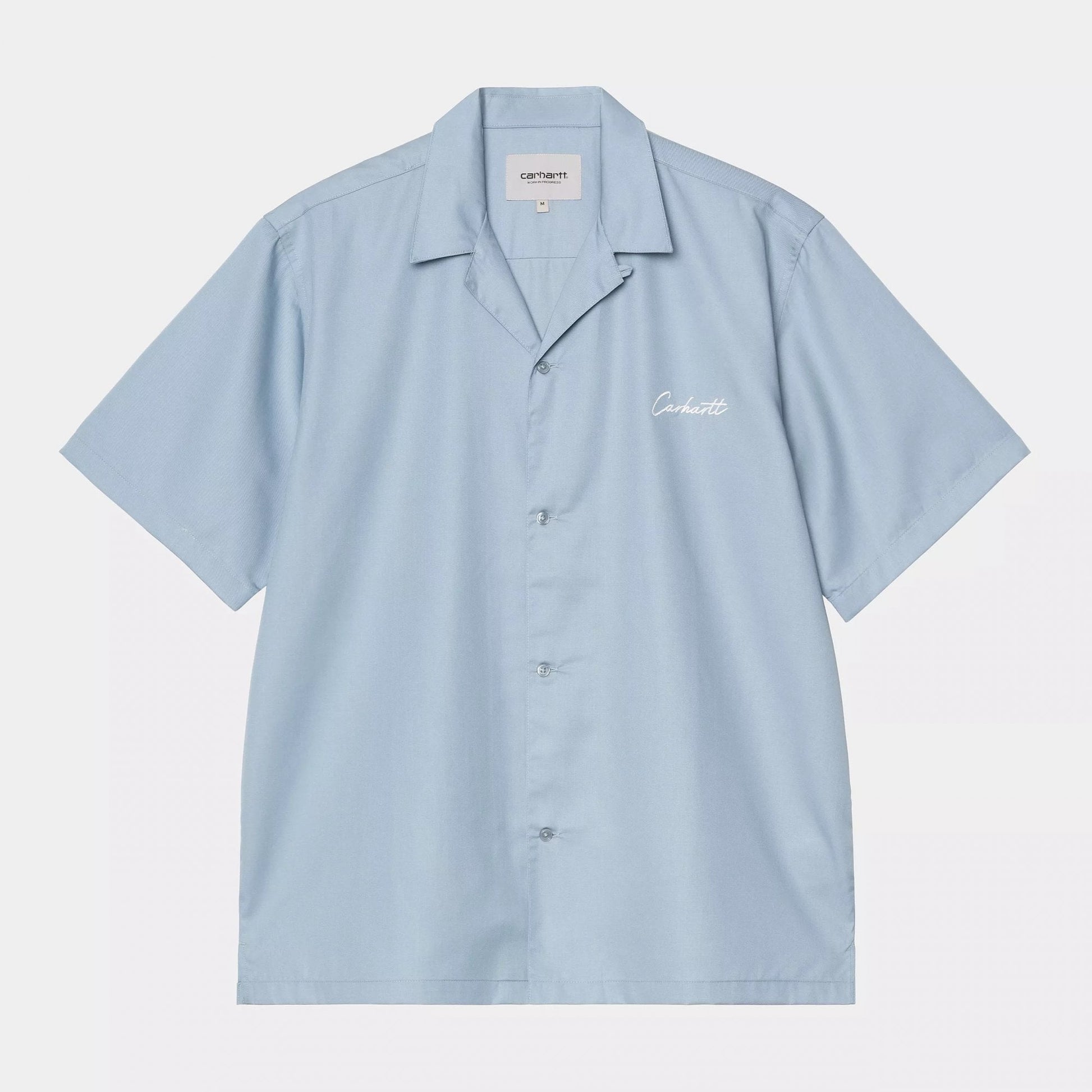 The S/S Delray Shirt is made from a lightweight lyocell-cotton twill. It also has a camp collar and buttoned front. Logo embroidery appears on the left chest.