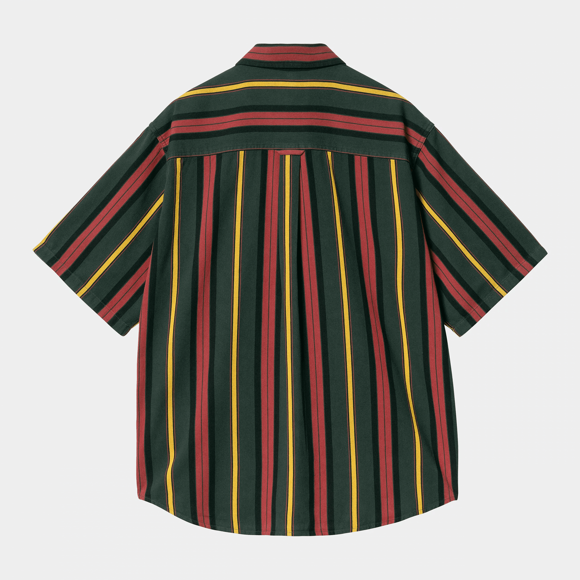 The S/S Jarrell Shirt is a loose fit style made from cotton twill, featuring allover vertical stripes. The item also has a buttoned front and collar. An embroidered 'C' Logo appears on the chest pocket.