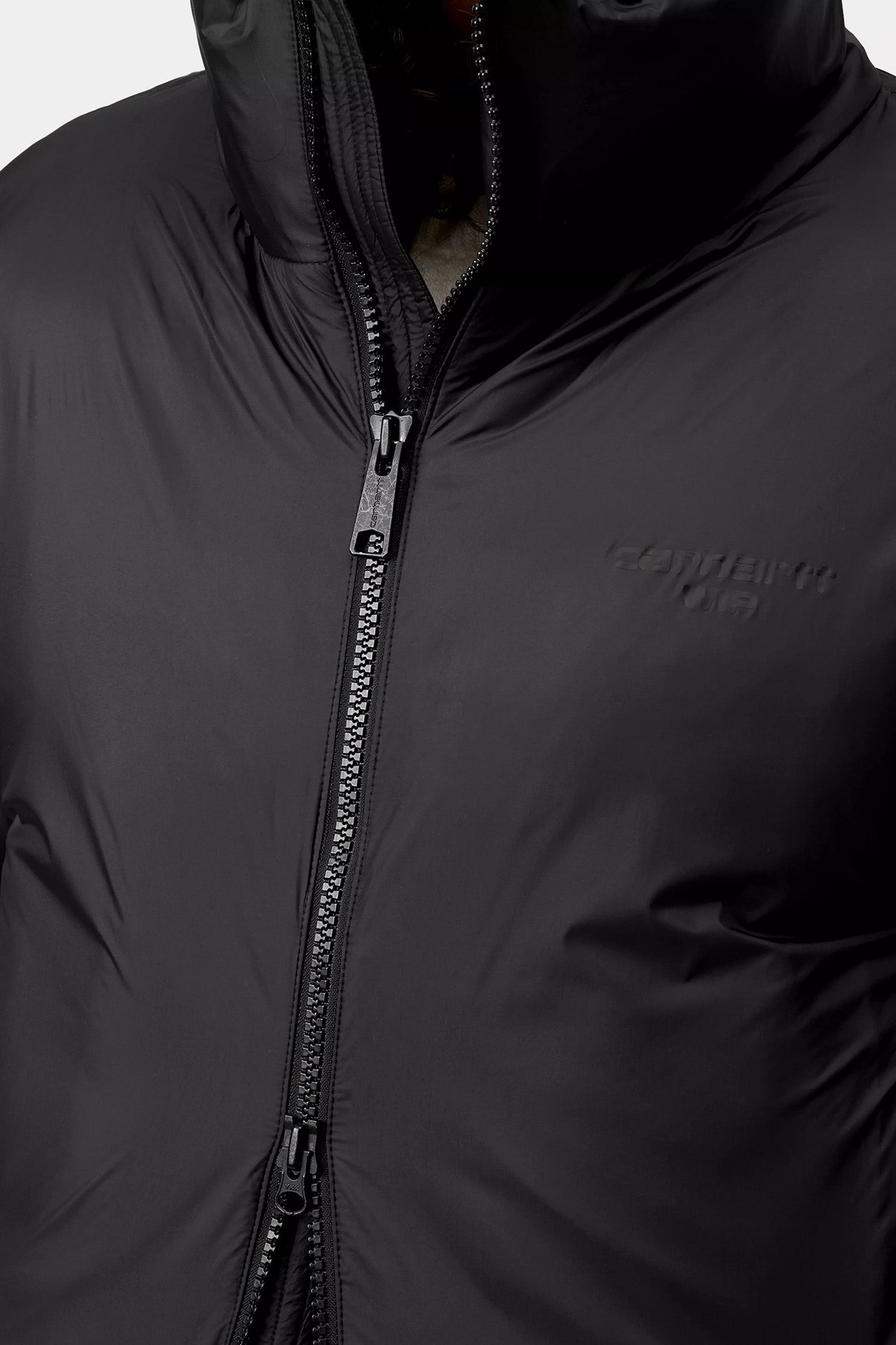 The Carhartt-WIP Women's Demi Jacket in black is made from lightweight nylon taffeta, padded with artificial down for warmth without extra weight. It features elasticated cuffs and an adjustable hem for a comfortable, flexible fit. The jacket includes a zipped front and two zipped side pockets for secure storage. A small Script Logo is displayed on the chest.