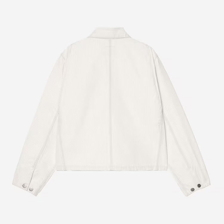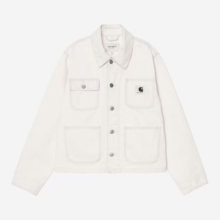 The Women's Mercer Chore Coat is Crafted from heavyweight, unlined cotton with allover bleached out hickory stripes, this chore coat delivers durability and timeless style. Four front pockets—including one with a buttoned flap—offer practical storage, while bartack stitching reinforces stress points for lasting wear. Finished with a woven Square Label detail.