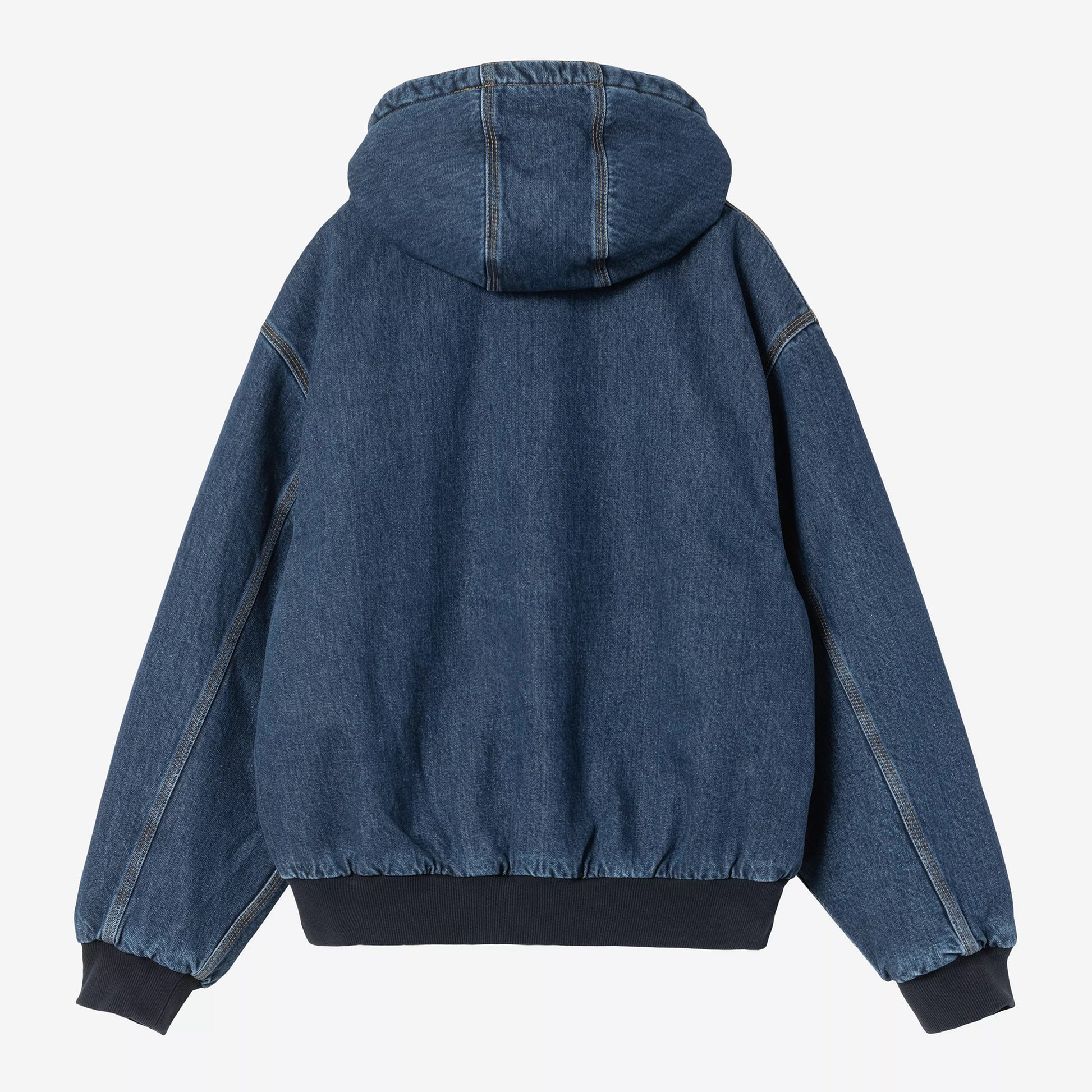 The Women's OG Active Jacket features a relaxed fit made from heavyweight Smith denim, stone-washed for softness and a worn-in look. It has a warm pile lining and diamond-quilted sleeves for extra insulation. Practical details include a kangaroo pocket and adjustable hood, while triple-stitching ensures long-lasting durability. Perfect for staying comfortable and warm during colder days.