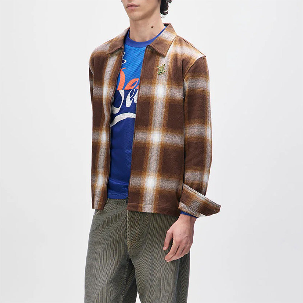 - Boxy cotton flannel jacket featuring shadow checkered pattern with graphic badges at chest