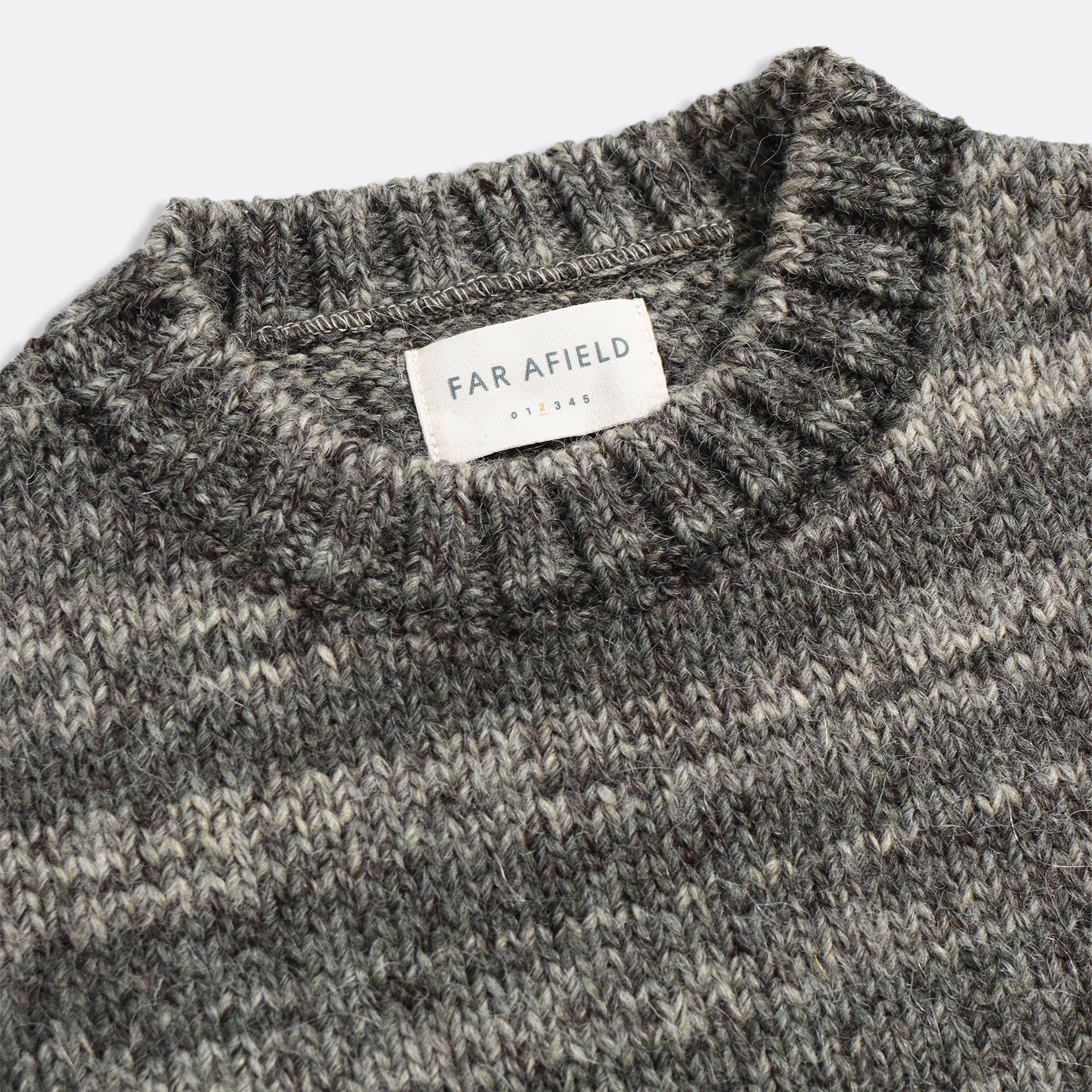 This grey crewneck knit, inspired by Haruomi Hosono with a rhythm that mirrors his layered approach to sound. features a unique horizontal stripe created with twisted yarns blending different tones. Made from a mix of alpaca, wool, and recycled acrylic, it offers warmth with a soft, textured feel. Perfect for everyday comfort.