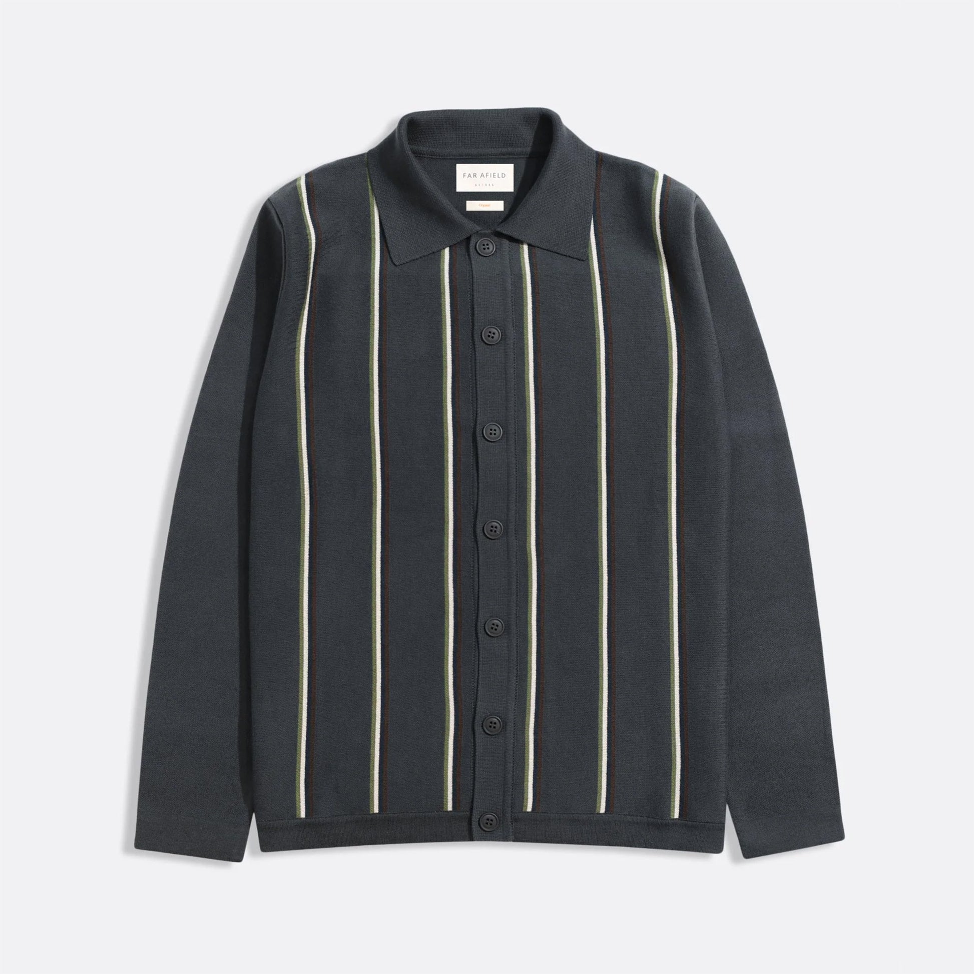The Zigger Cardigan in Grey Stripe is crafted from midweight organic cotton, offering a crisp and structured feel. Its engineered stripes are spaced with contrasting tones, drawing inspiration from vintage shirts, record sleeves, and modernist furniture design. This timeless piece refreshes a classic silhouette with unique pattern details.