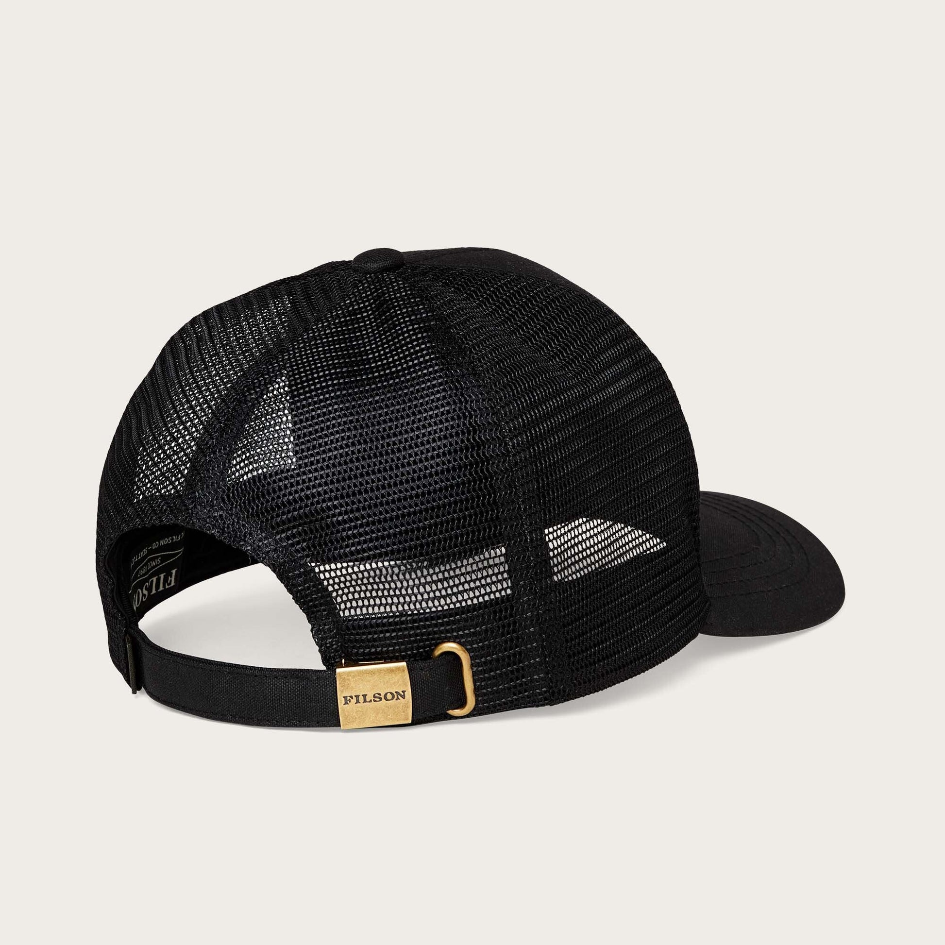 This classic Filson cap hugs your head comfortably, with an adjustable strap and brass buckle on the back. This six-panel cap features a pre-curved bill for protection from sun and rain, and a bold Filson patch on the front. Made of iconic, durable oil finish Tin Cloth with a mesh back for breathability, it's built to last through years of regular use.