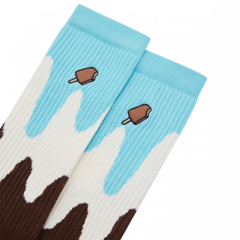 Pharrell Williams" BBC ICECREAM Spring '25 - DRIPPY ribbed crew socks, detailed with woven drippy design, emboidered popsicle on. the side and printed icecream logo on the bottom.