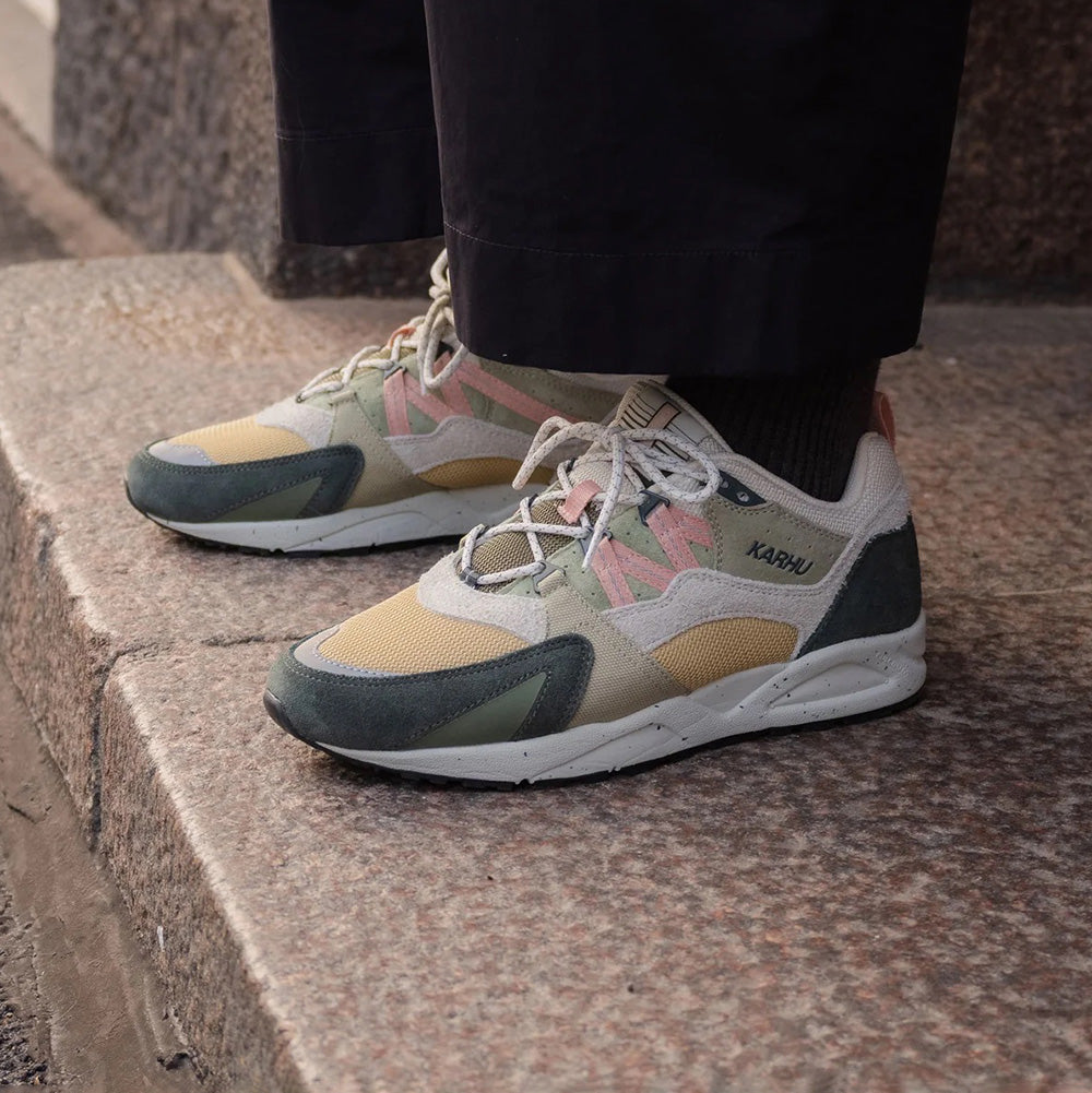 The KARHU Fusion 2.0 in Darkest Spruce and Cameo Rose pays homage to the iconic 1996 model, blending classic design with contemporary enhancements. Crafted for both men and women, this sneaker offers improved comfort and durability while maintaining its retro aesthetic. A great choice for those who value heritage, performance & comfort in their footwear.