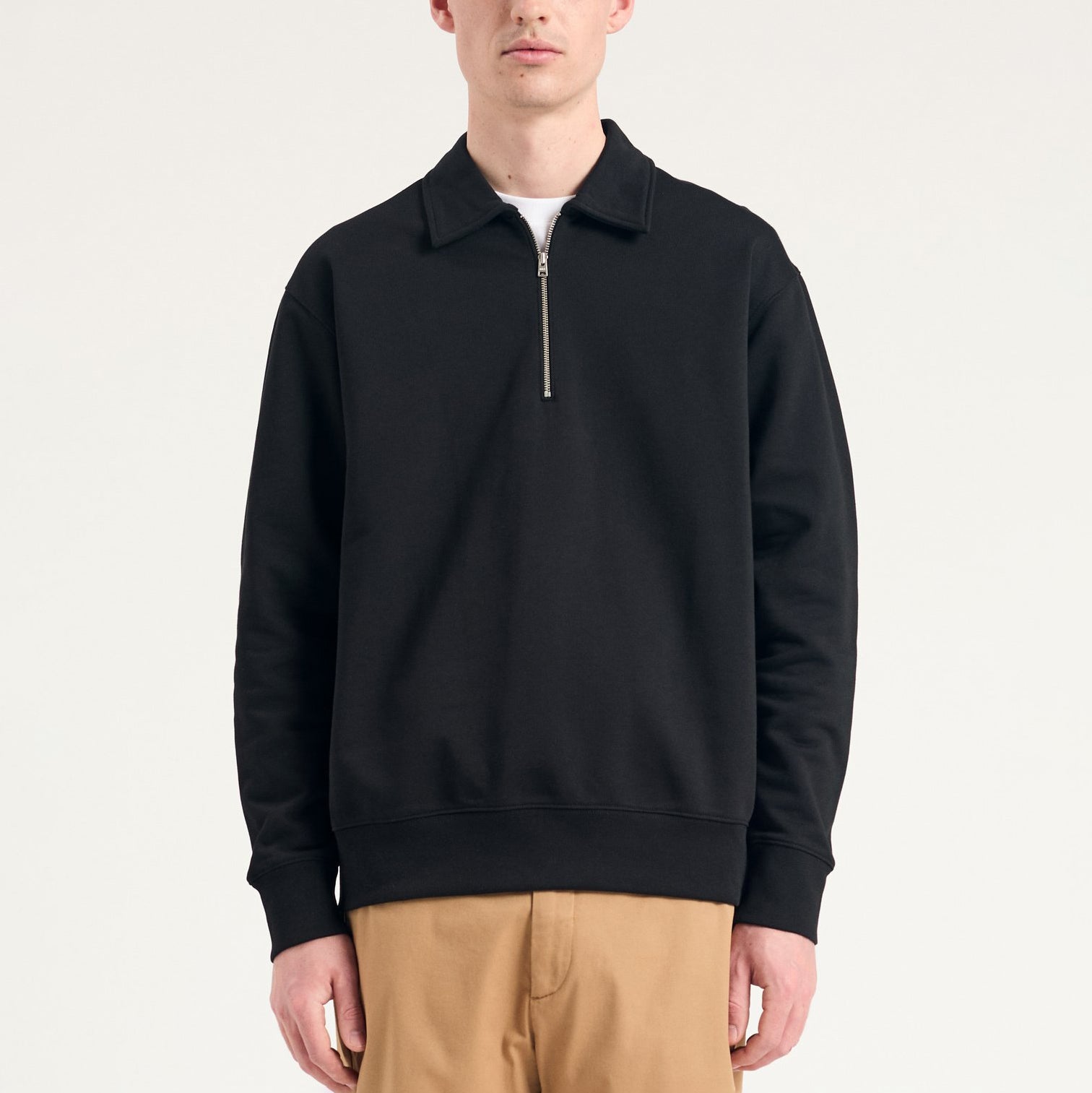 The Norse Standard Half Zip Sweatshirt in black is crafted from midweight organic cotton loopback terry. It has a regular fit with set-in sleeves and a branded metal zipper. Ribbed collar, cuffs, and hem provide a neat finish, while a branded tab on the side seam adds a subtle detail.