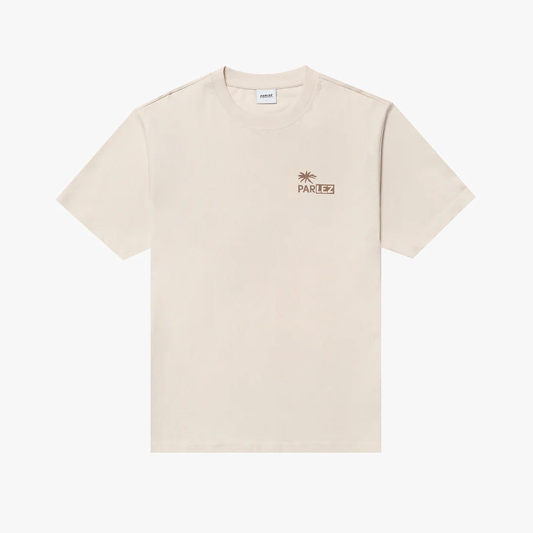 The Destin T-Shirt in Beach features premium GOTS Certified organic cotton. The classic short-sleeve silhouette includes a ribbed crewneck, chest branding, and a striking back design.