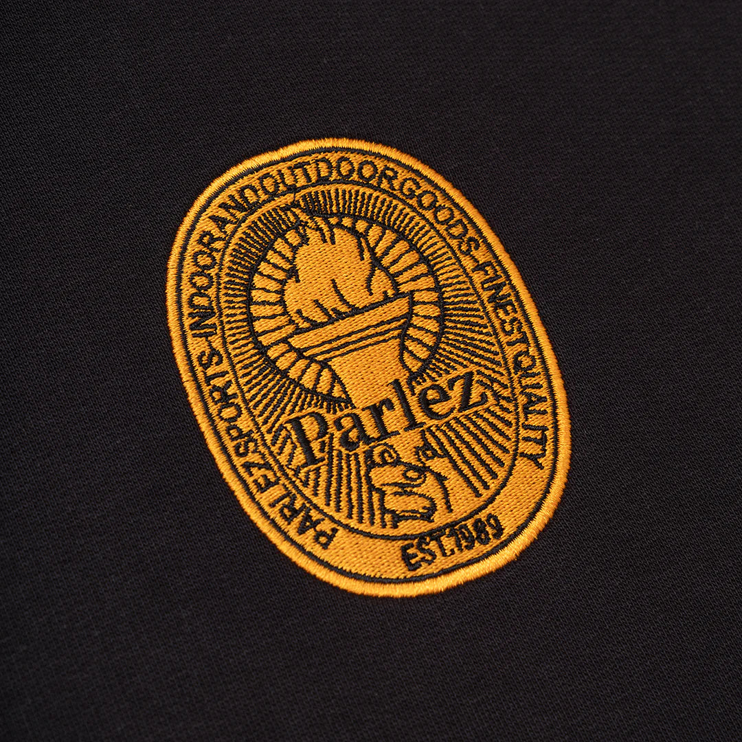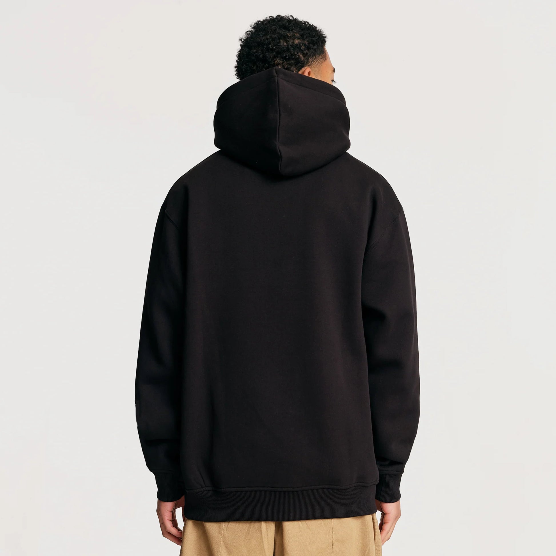The Flare Hood in Black is a heavyweight pullover hoodie crafted from a sustainable blend of 80% organic cotton and 20% recycled polyester. Featuring a soft brushed interior for comfort, it includes a classic kangaroo pocket, adjustable drawstring hood with metal eyelets, and ribbed trims for a refined finish. The double-layered hood provides extra warmth and structure, while an embroidered graphic on the chest adds a distinctive touch. Perfect for everyday wear with a focus on quality and sustainability.