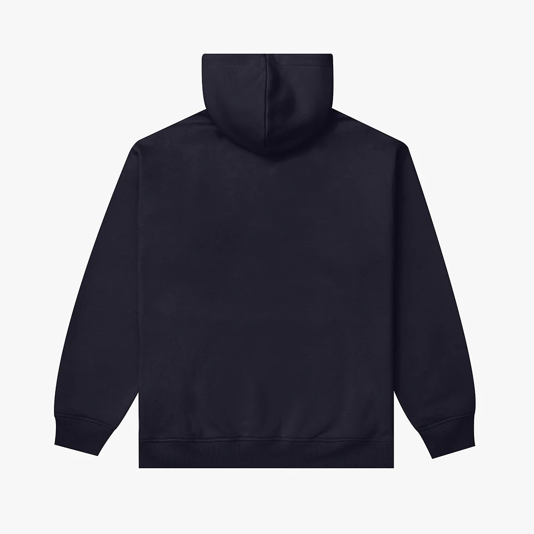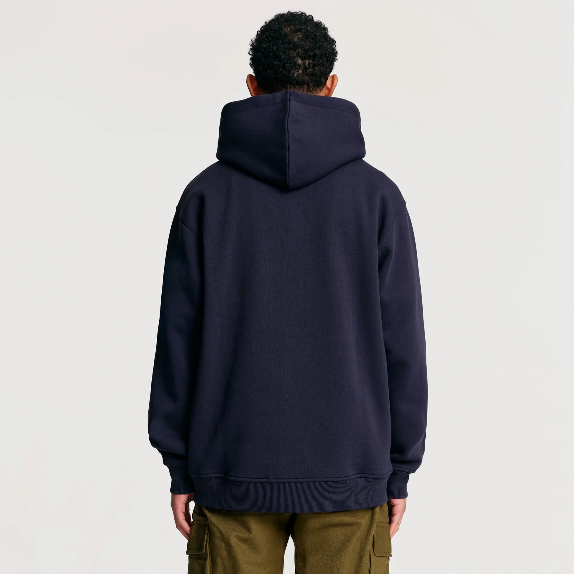 The Flare Hoody in Midnight is a heavyweight pullover hoodie crafted from a sustainable blend of 80% organic cotton and 20% recycled polyester. Featuring a soft brushed interior for comfort, it includes a classic kangaroo pocket, adjustable drawstring hood with metal eyelets, and ribbed trims for a refined finish. The double-layered hood provides extra warmth and structure, while an embroidered graphic on the chest adds a distinctive touch. Perfect for everyday wear with a focus on quality and sustainability.