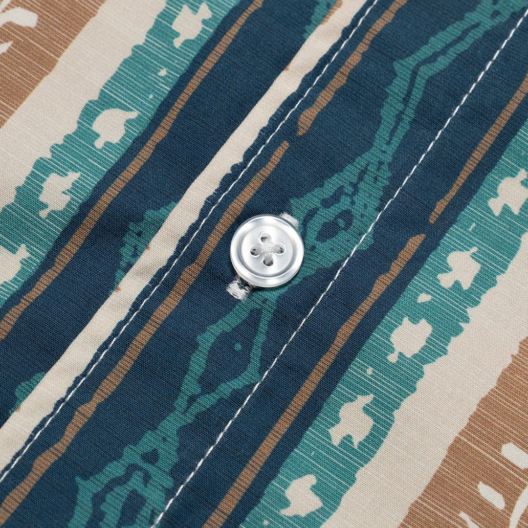 The Nevada features a classic spread collar, single chest patch pocket, and curved hem for a refined silhouette. An all-over geometric stripe in teal and sand adds visual interest to this versatile short-sleeve lightweight 100% organic cotton poplin shirt with a relaxed, everyday appeal.