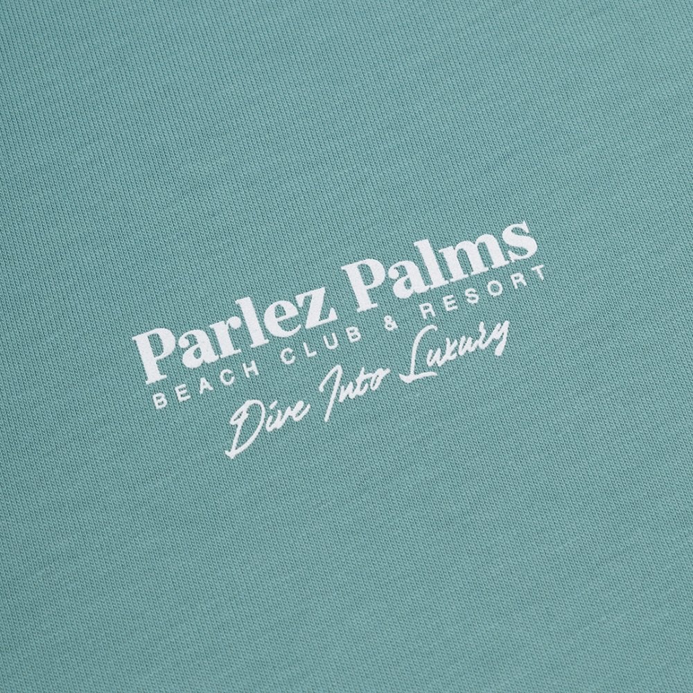 The Parlez Retreat T-Shirt in Sage Shore. A short sleeve tee made from premium GOTS Certified, 100% organic cotton with a classic ribbed crewneck. Detailed with a small, printed logo on the chest and a large resort print on the back.