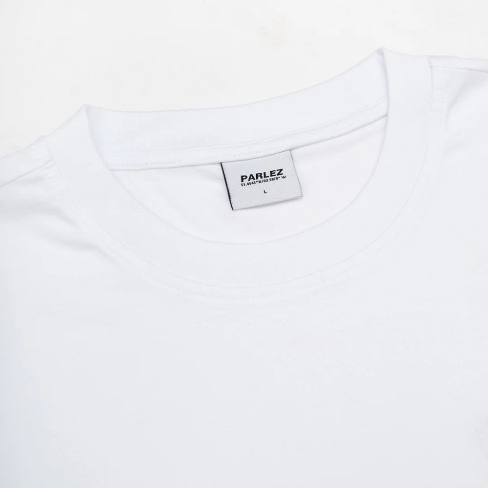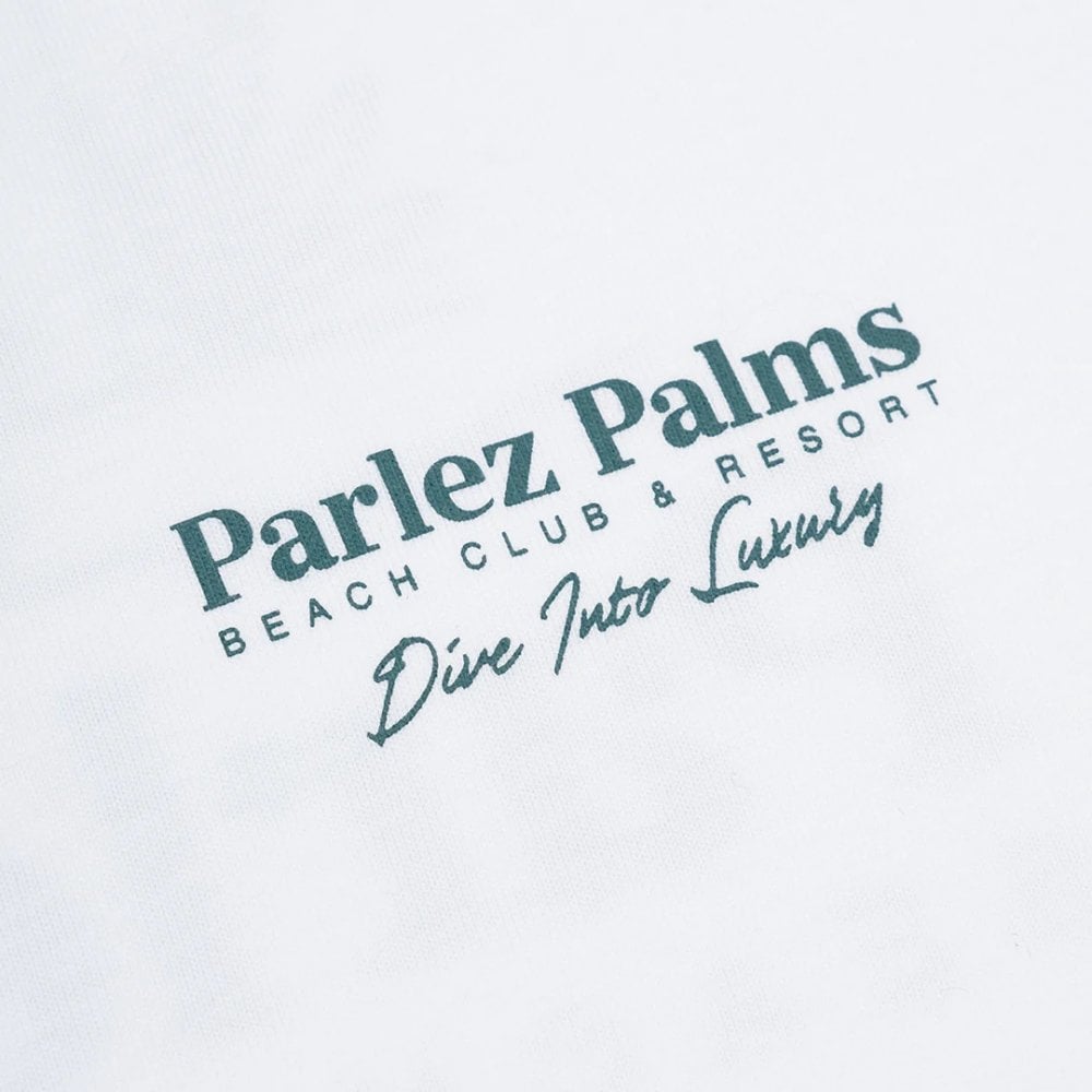 The Parlez Retreat T-Shirt in White. A short sleeve tee made from premium GOTS Certified, 100% organic cotton with a classic ribbed crewneck. Detailed with a small, printed logo on the chest and a large resort print on the back.