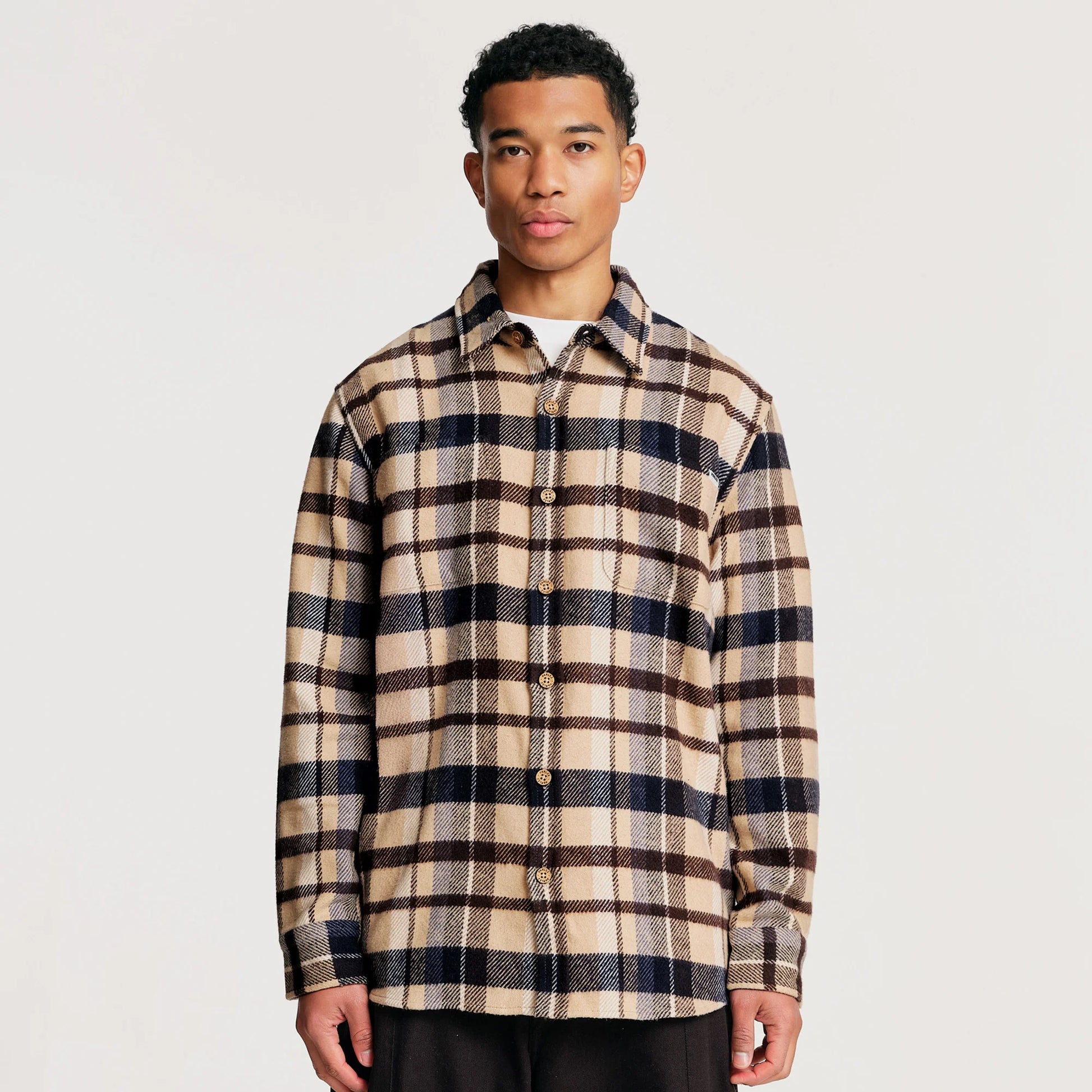 The Rivington Shirt in Blue Check is a timeless wardrobe essential made from a sustainable blend of 65% recycled cotton and 35% recycled polyester. This classic plaid design features a spread collar, dual chest pockets, and coconut shell buttons for an authentic touch. The curved hem and button closure cuffs complete the refined look.