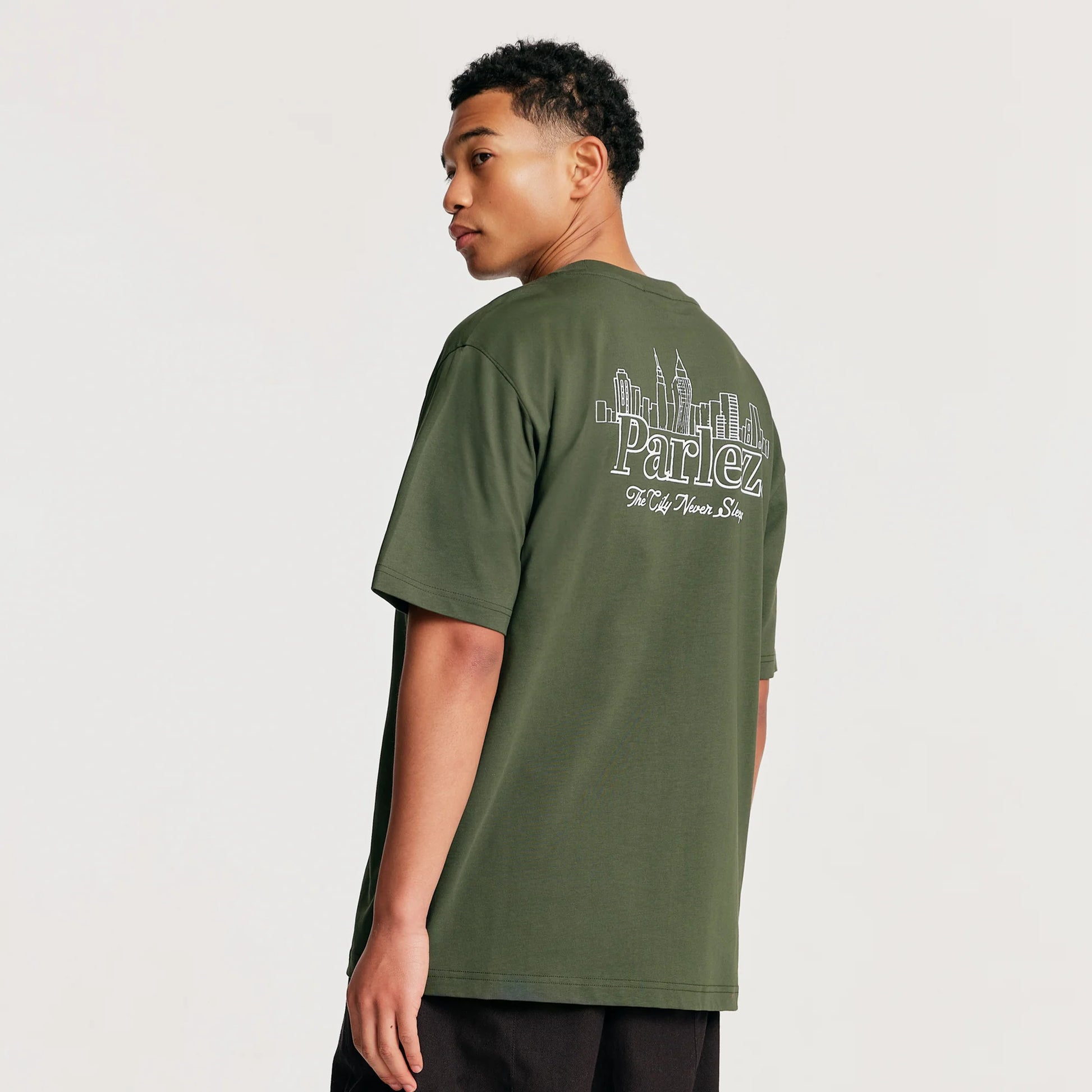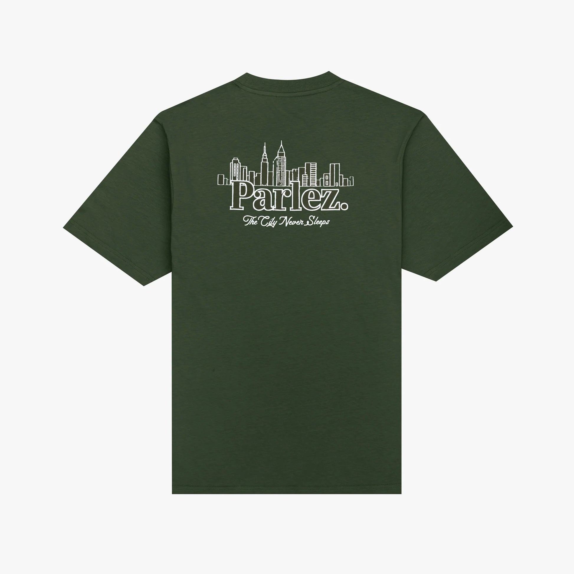 The Scape T-Shirt is crafted from GOTS-certified organic cotton. Featuring a structured ribbed crewneck and short sleeves, it offers everyday comfort and durability. The design features striking printed New York skyline graphics across the chest and back.
