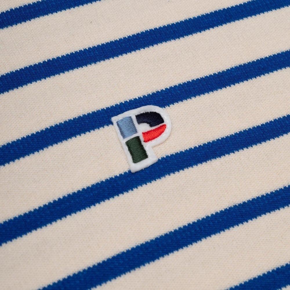 The Parlez Shore Crew in Azure. A long sleeve ringer sweatshirt made from a lightweight, 100% organic cotton. Featuring an all-over horizontal stripe, ribbed cuffs and an open hem. Detailed with an embroidered 'P' patch on the chest.