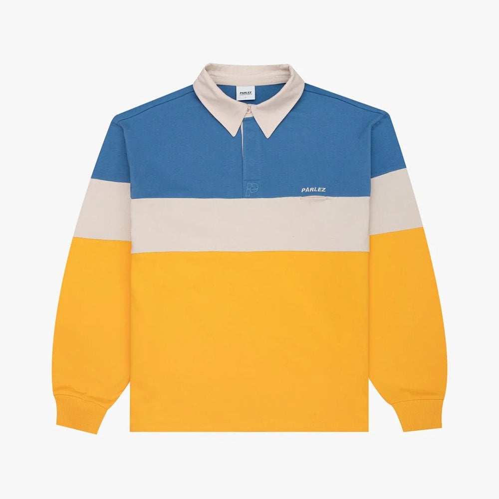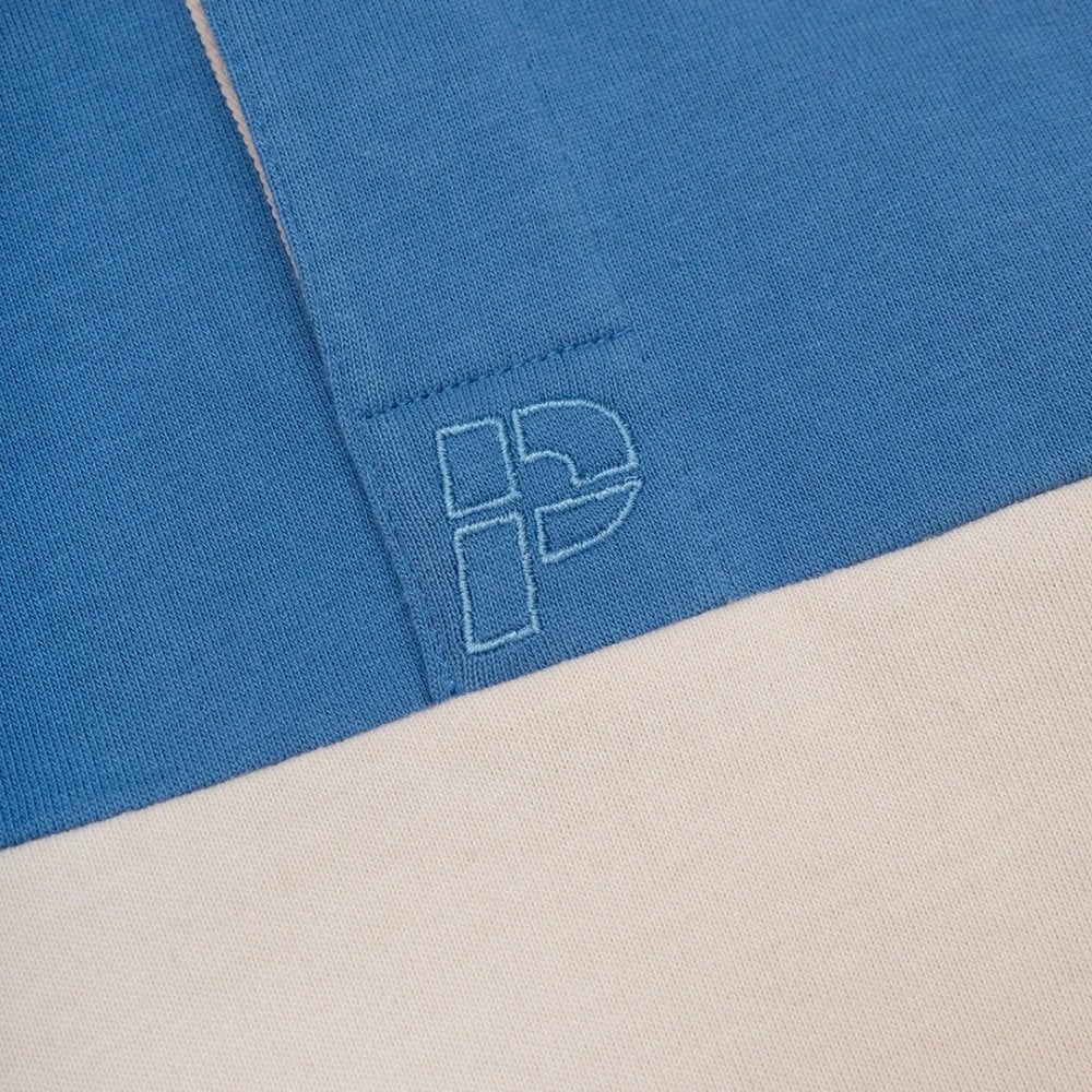 The Parlez Strive Rugby Shirt in Azure Blue. A classic rugby silhouette made from premium 100% organic cotton. Featuring a cotton twill collar with concealed button placket and a small, concealed chest pocket. Detailed with colour block panelling and an embroidered logo on the chest.