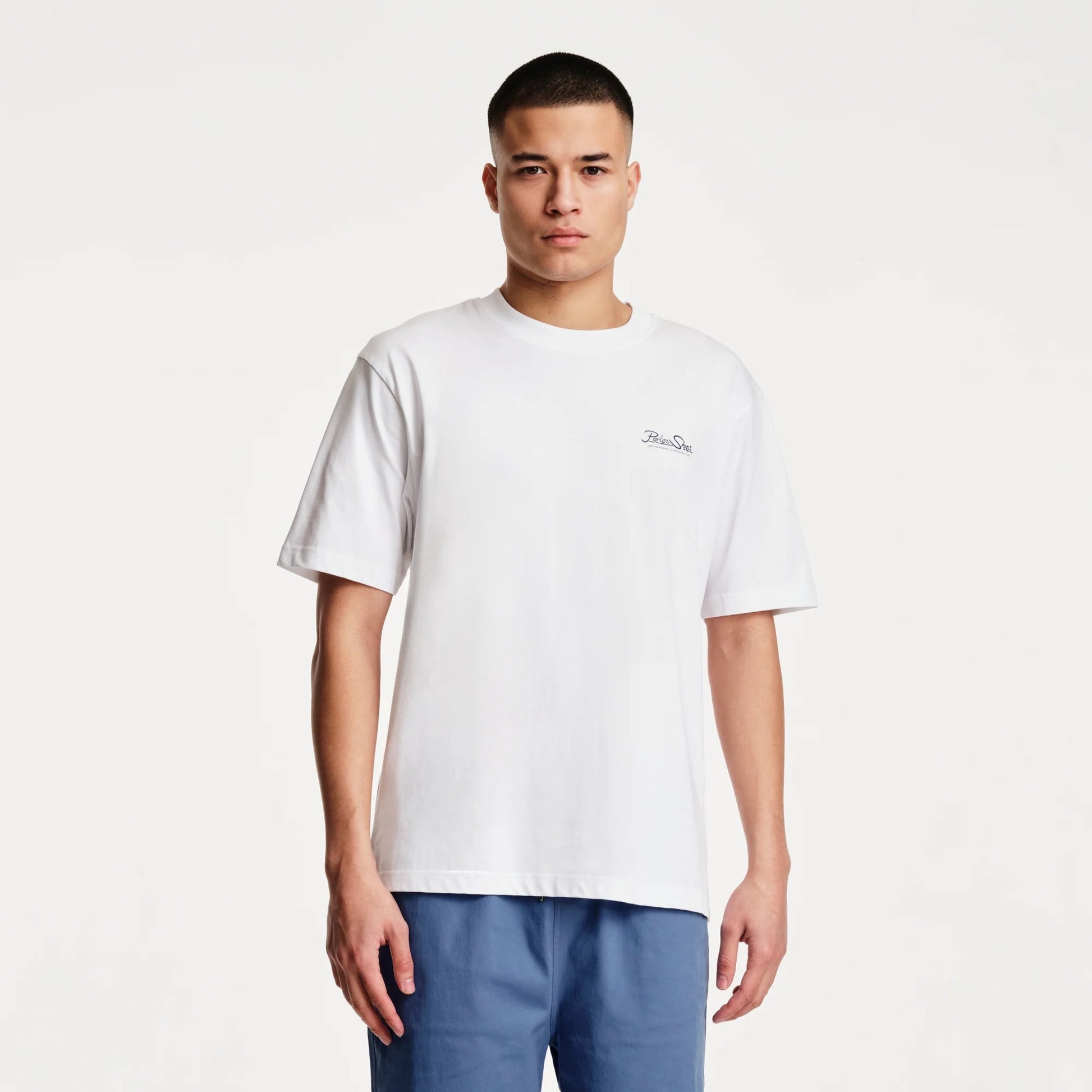 Vacancy T-Shirt in crisp white, made from GOTS Certified organic cotton for comfort and sustainability. Features a classic ribbed crewneck, small chest logo, and striking large-scale back design.