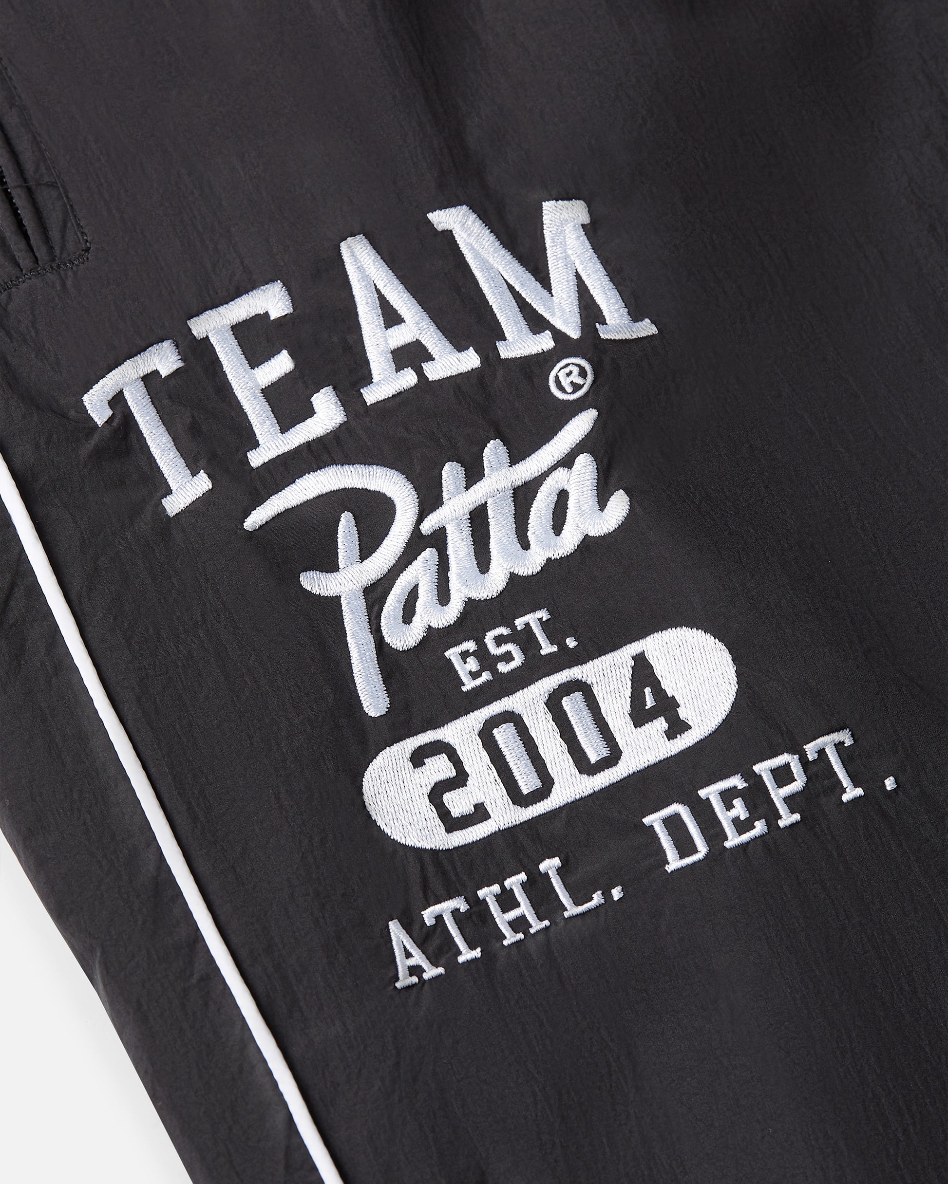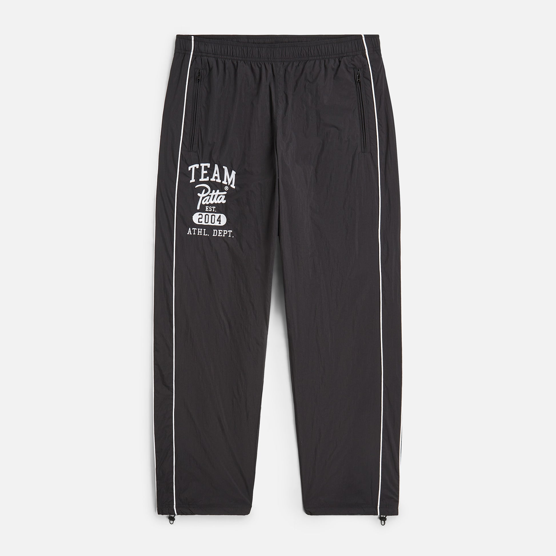 These Patta Athletic Nylon Track Pants feature an elasticated waist and leg hems with drawcords for a secure fit. The left leg displays embroidered artwork, adding a subtle design touch. Equipped with a Patta branded YKK zipper and two side pockets with YKK zip closures.