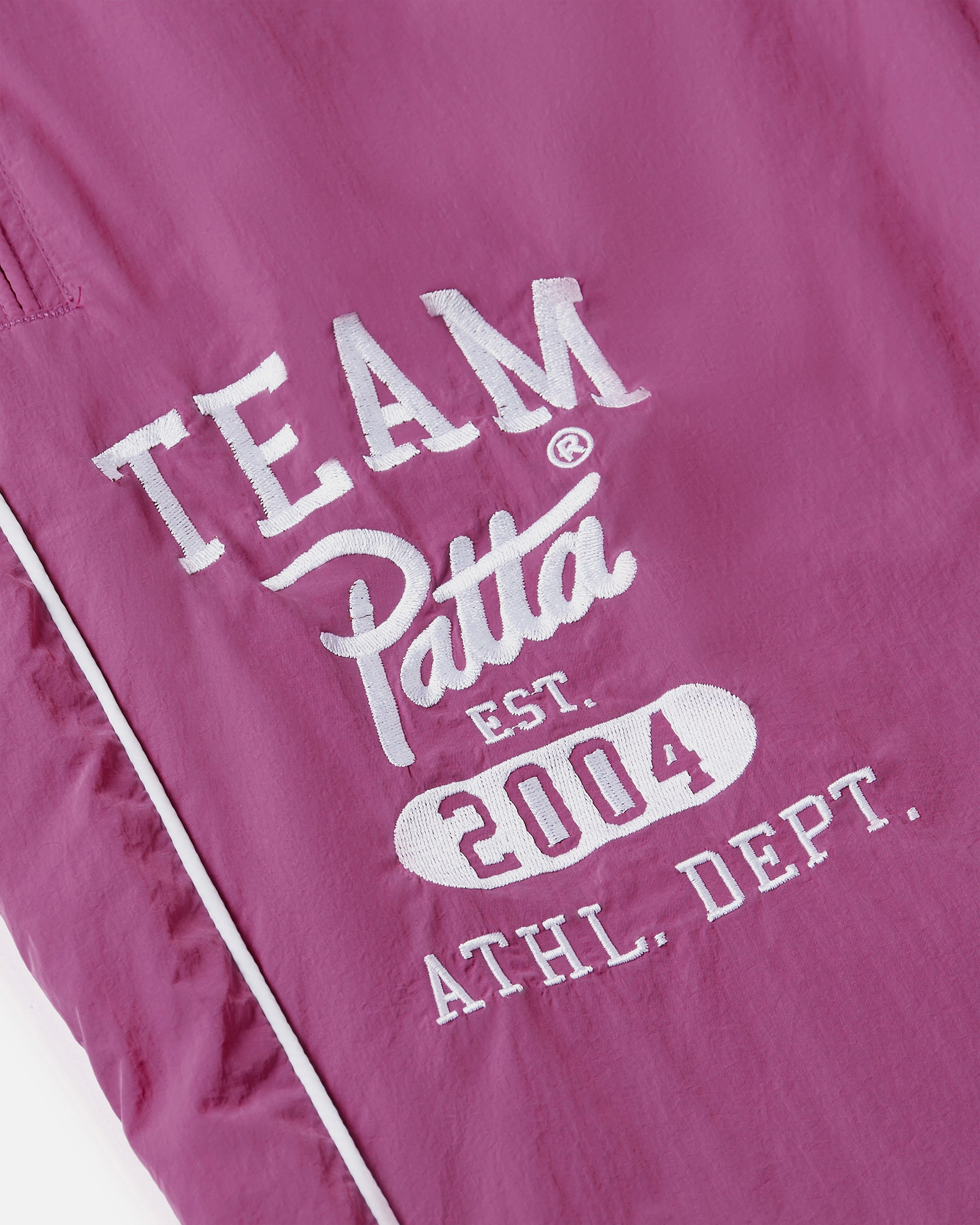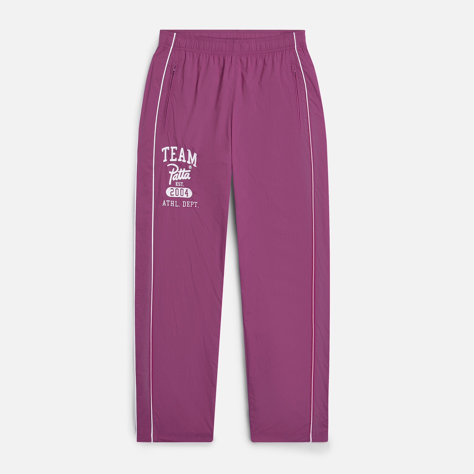 These Patta Athletic Nylon Track Pants feature an elasticated waist and leg hems with drawcords for a secure fit. The left leg displays embroidered artwork, adding a subtle design touch. Equipped with a Patta branded YKK zipper and two side pockets with YKK zip closures.