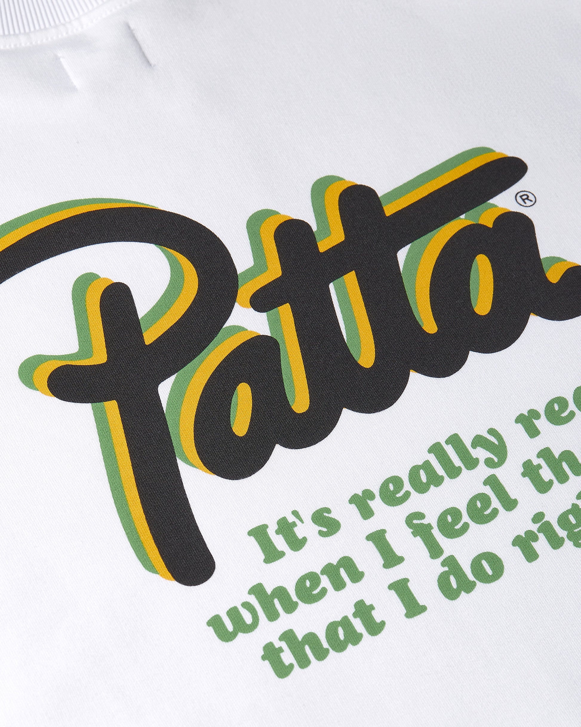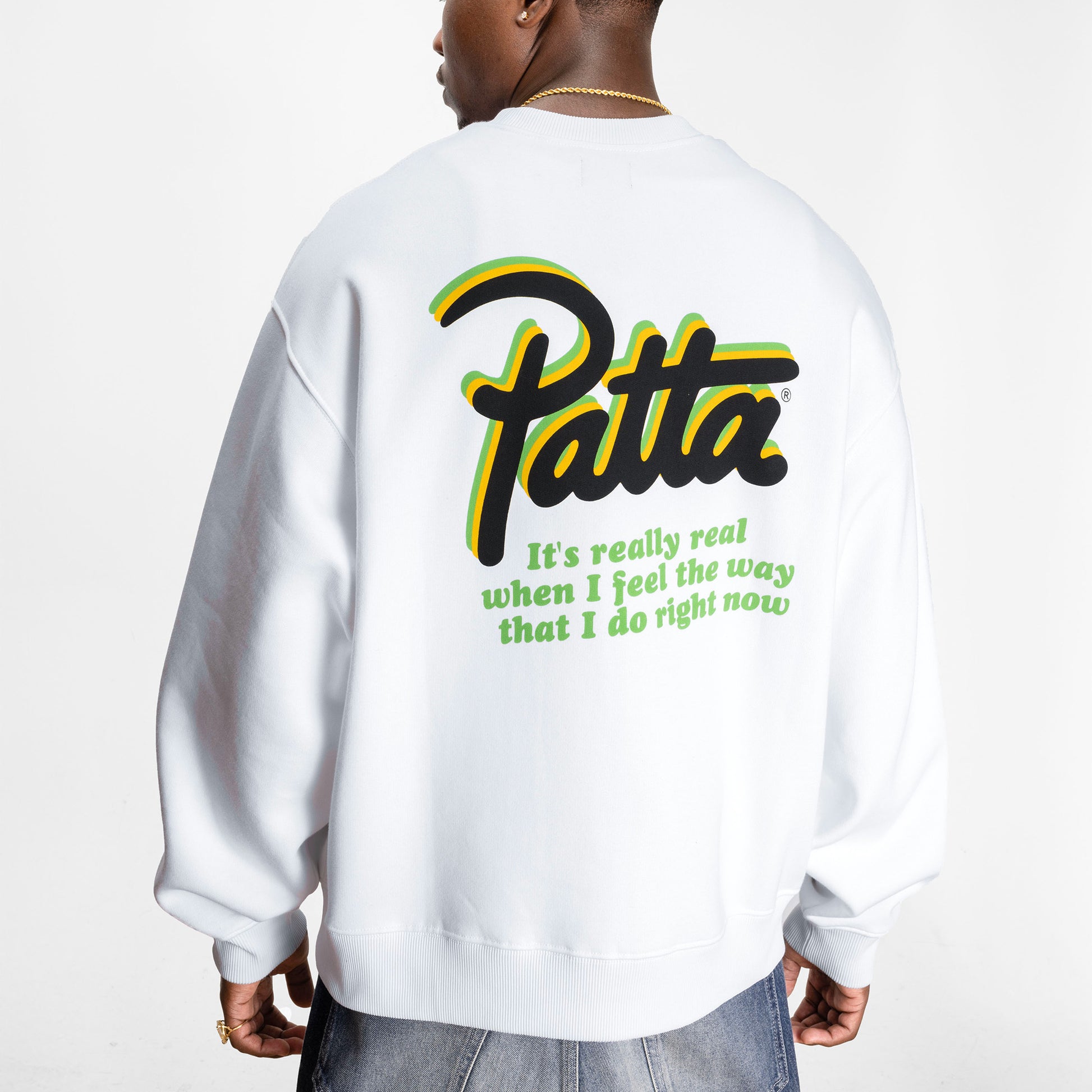 The Patta Block Party Crewneck Sweater is made from 100% cotton with a soft 450 gsm brushed sweat fabric. It features silkscreen artwork on the front panel and a script logo printed on the back.