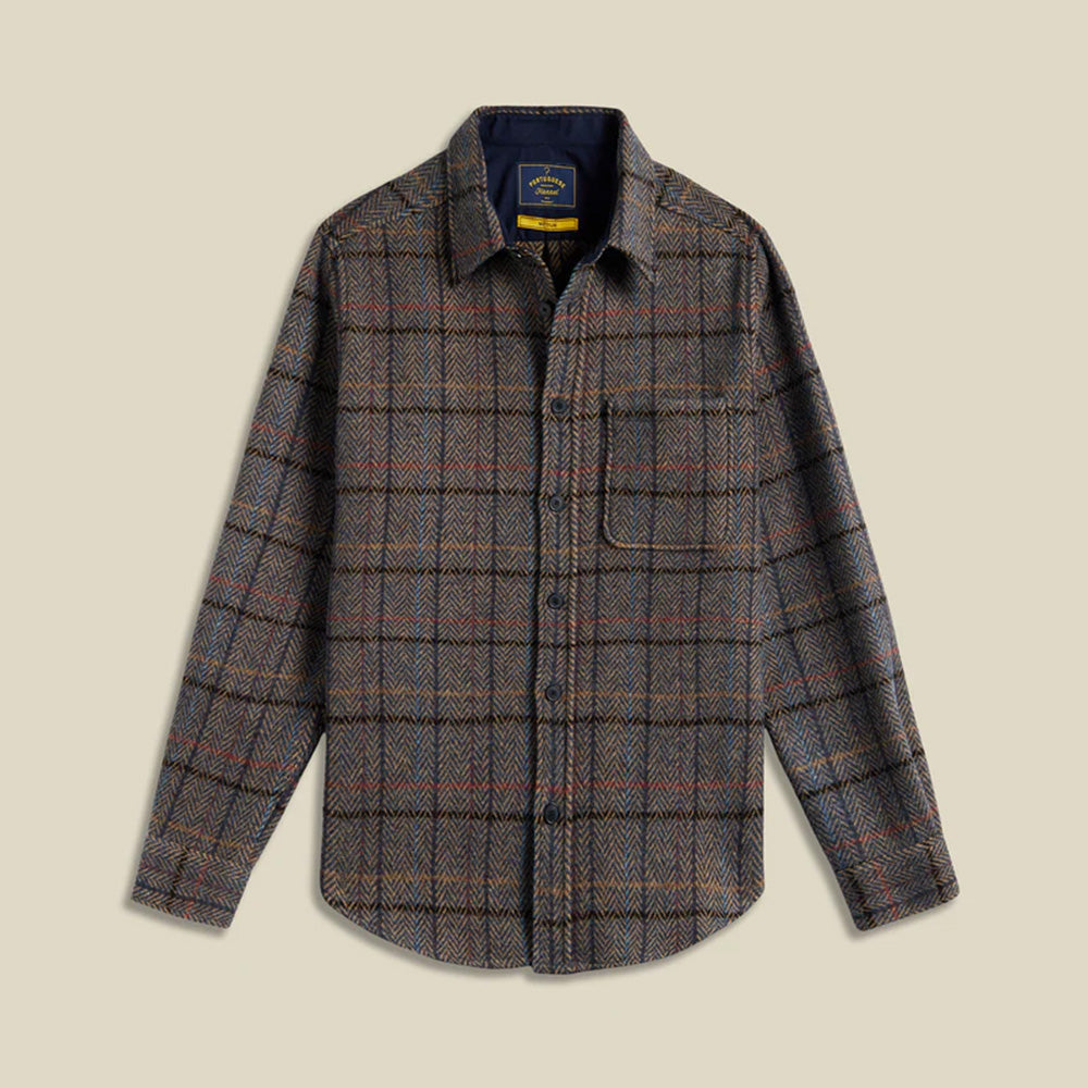 The 'Type' Shirt by Portuguese Flannel in Brown Herringbone is crafted from 100% wool and made in Portugal. It features recycled polyester buttons combining sustainability with quality craftsmanship. Ideal for adding a natural, textured touch to your wardrobe.