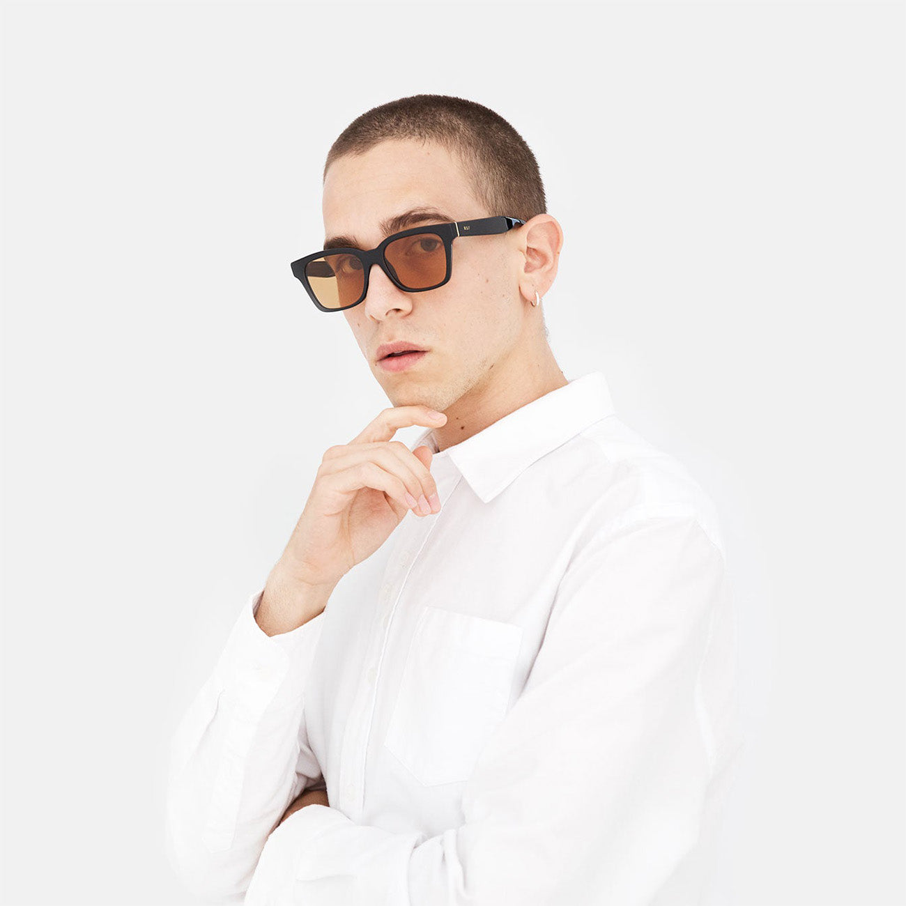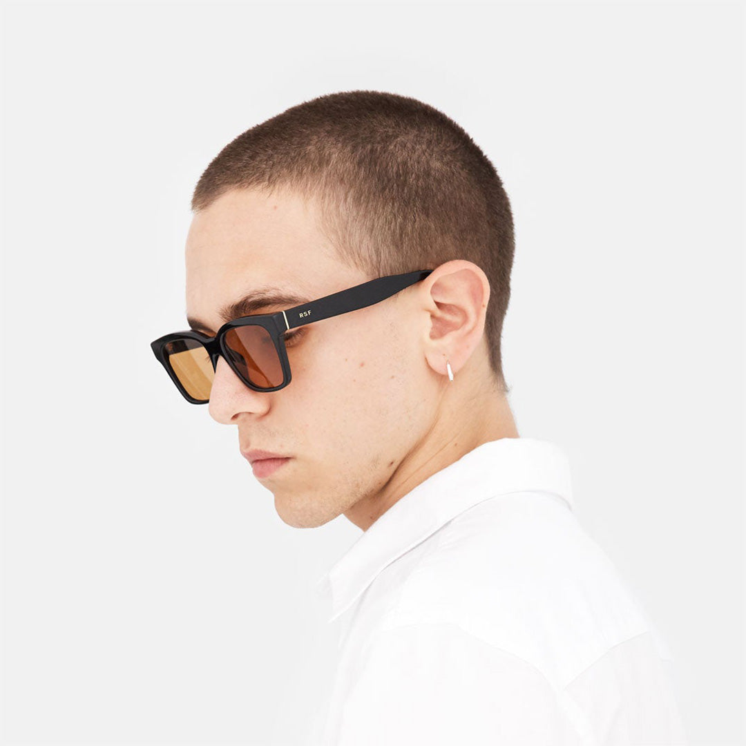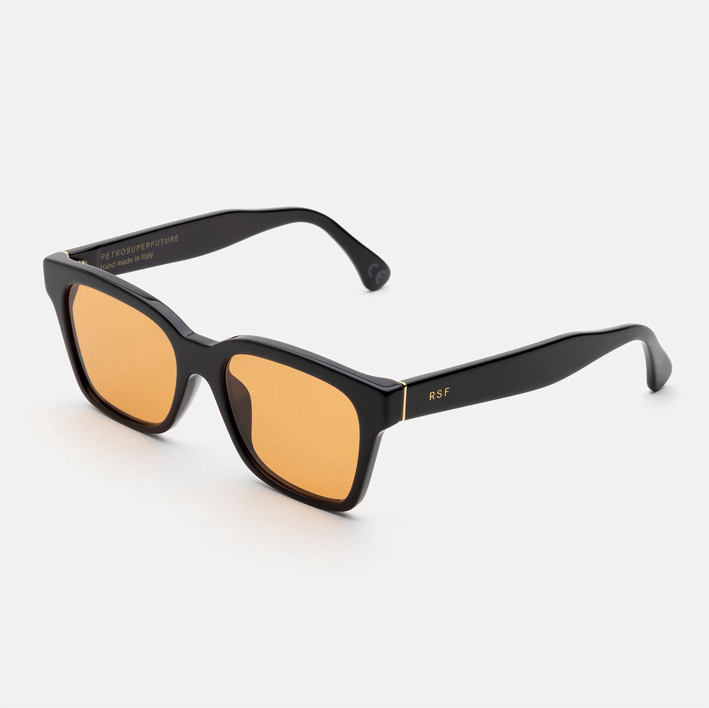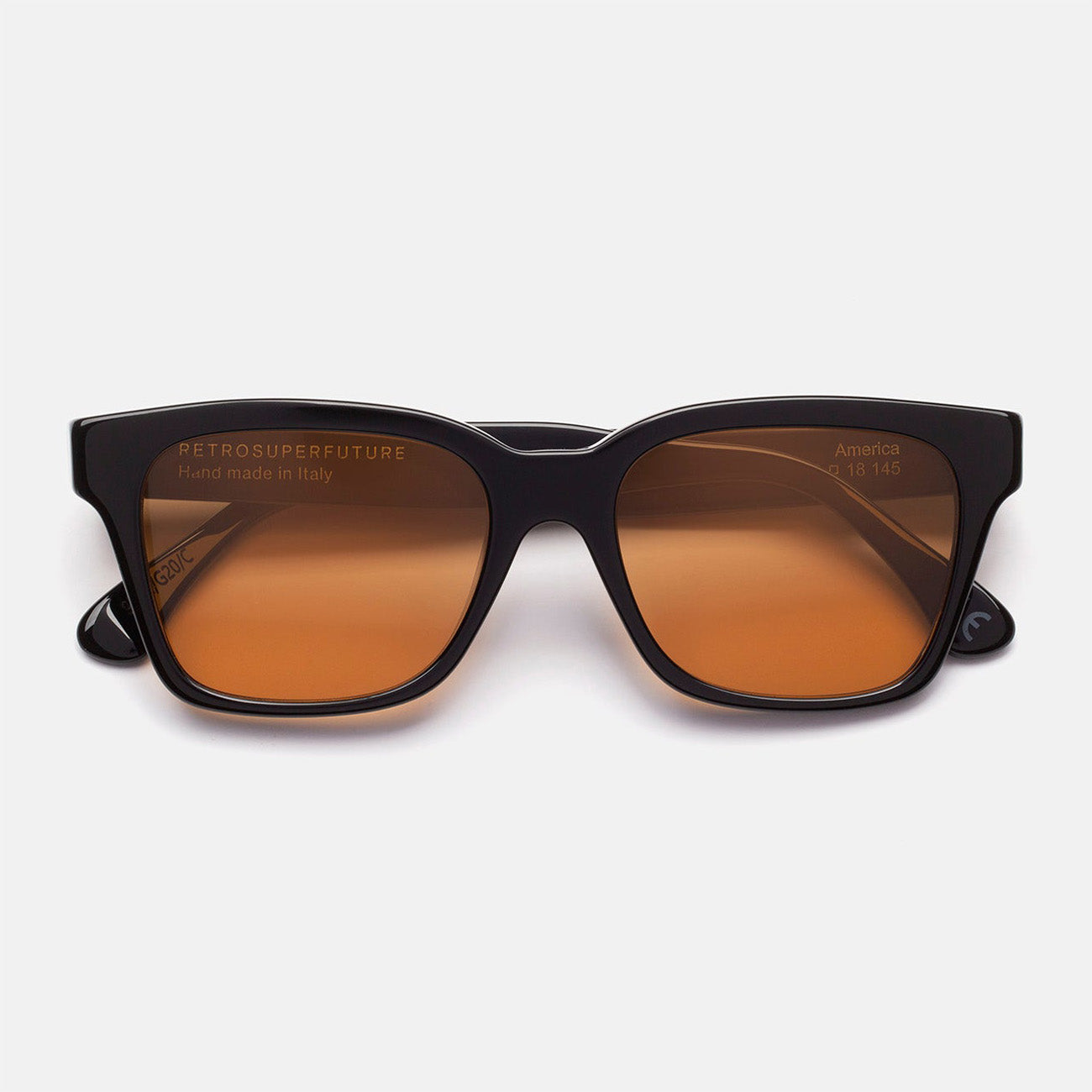 The America - Refined reimagines a timeless eyewear classic with contemporary polish. Handcrafted in Italy with angular rims and Carl Zeiss lenses defining the silhouette, while orange tinted lenses offer subtle sophistication. Shiny black acetate front paired with warm Havana temples creates striking contrast. Includes semi-hard protective case and cleaning cloth