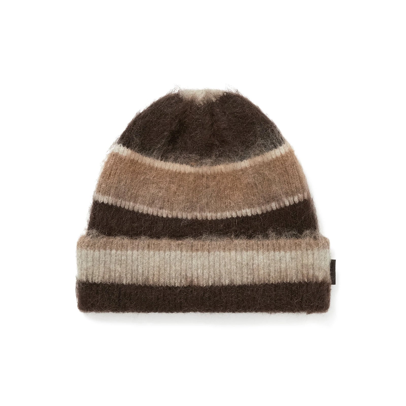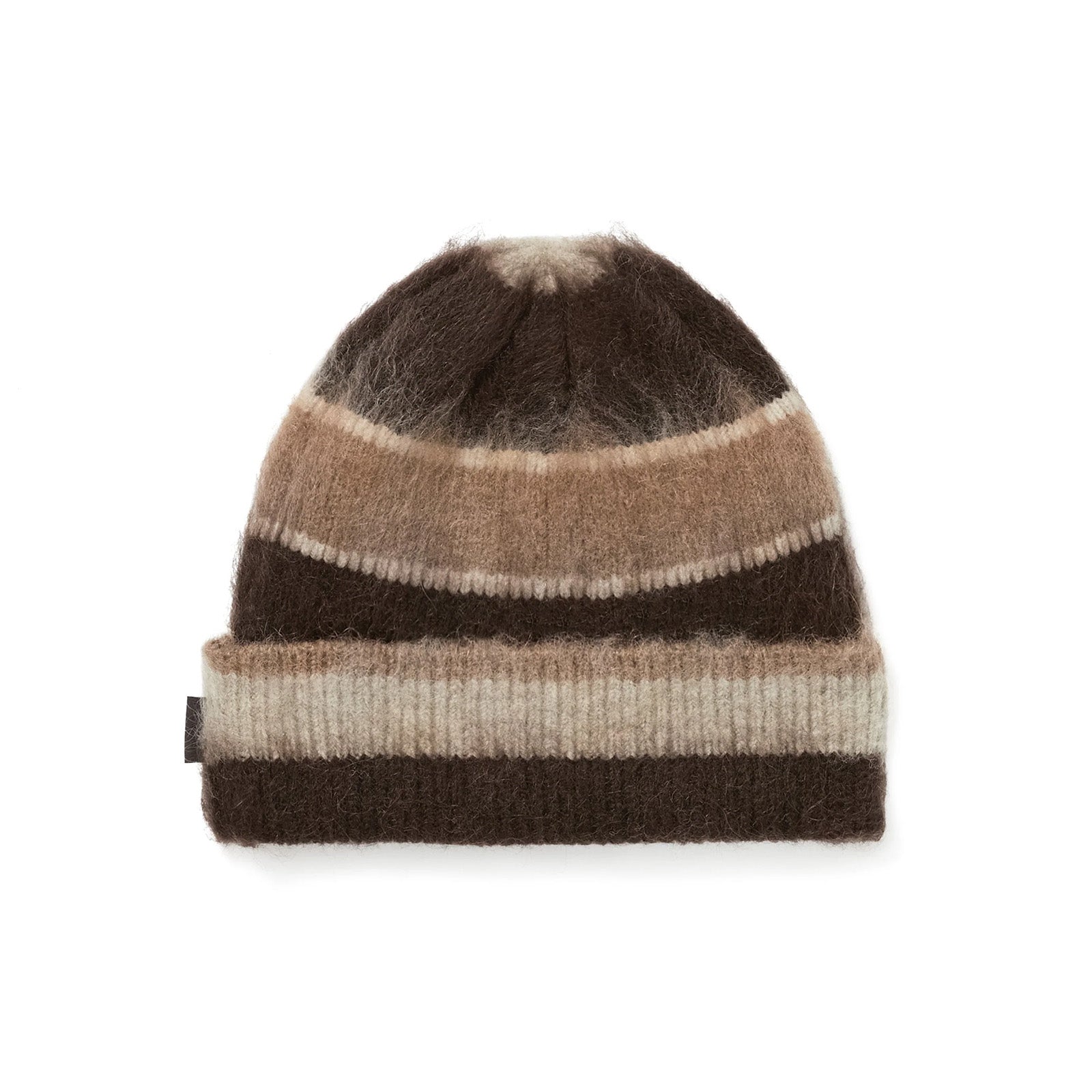 A warm, versatile beanie crafted from a premium blend of mohair, wool, and acrylic for softness and durability. The striped pattern adds visual interest.