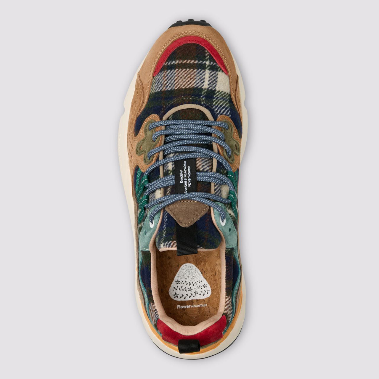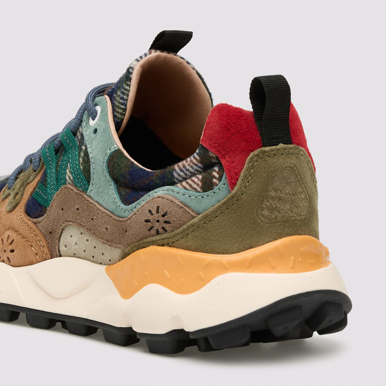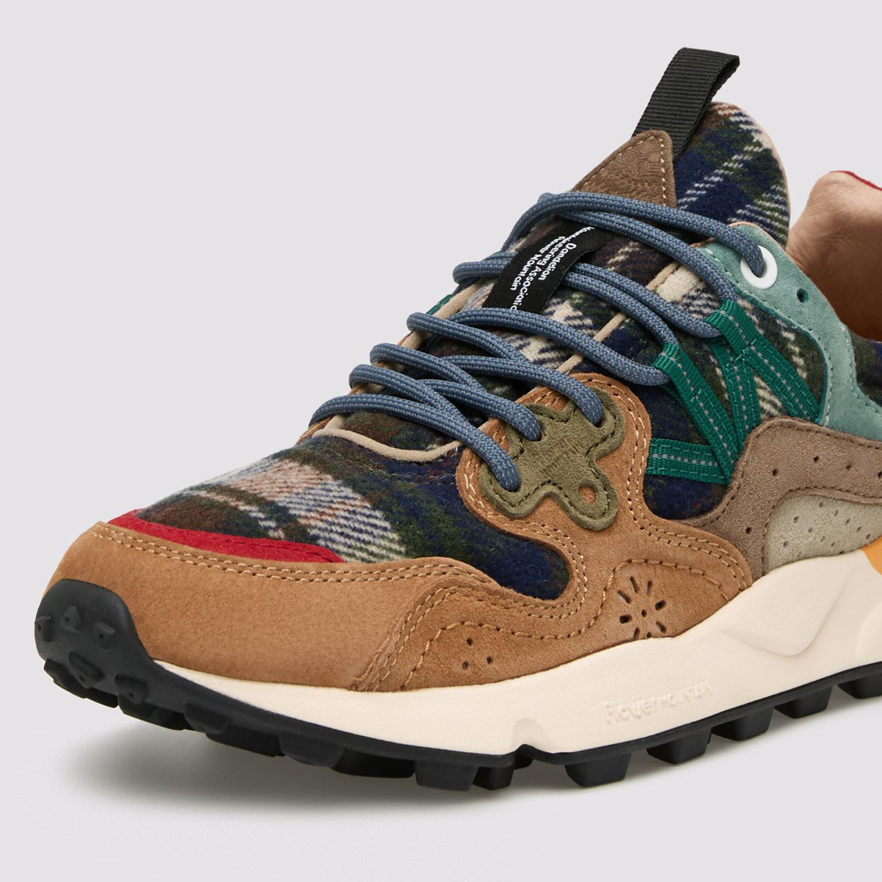 These outdoor-inspired sneakers feature a suede and tartan-effect fabric upper with suede overlays. They have contrasting trekking laces threaded through reinforced flower-shaped eyelets, a signature brand detail. Inside, fabric and leather linings combine with a natural antibacterial cork insole for comfort. The ultra-lightweight rubber sole with a toothed tread offers good grip and durability.